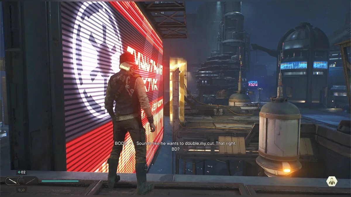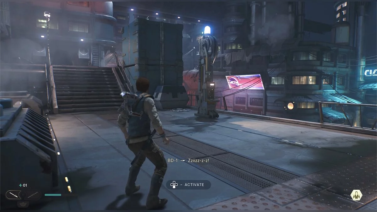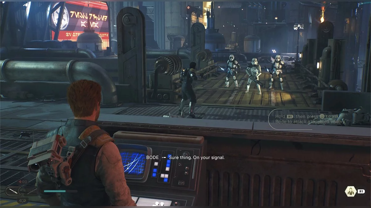 Продолжайте двигаться вперед, пока не доберетесь до спуска к штурмовикам. Разберитесь с ними. Активируйте лифт и прикажите Боуду атаковать новую группу штурмовиков. Немного впереди рекламный щит, который ваш спутник может развернуть так, чтобы Кэл мог пробежать. Впереди еще одно место для медитации. Поднимайтесь по лестнице справа и снова пробегите по рекламному щиту. Слева будет дверь, а за ней имперские дроиды. Перед «смертью» они взрываются. Поднимитесь по лестнице и убейте всех врагов.