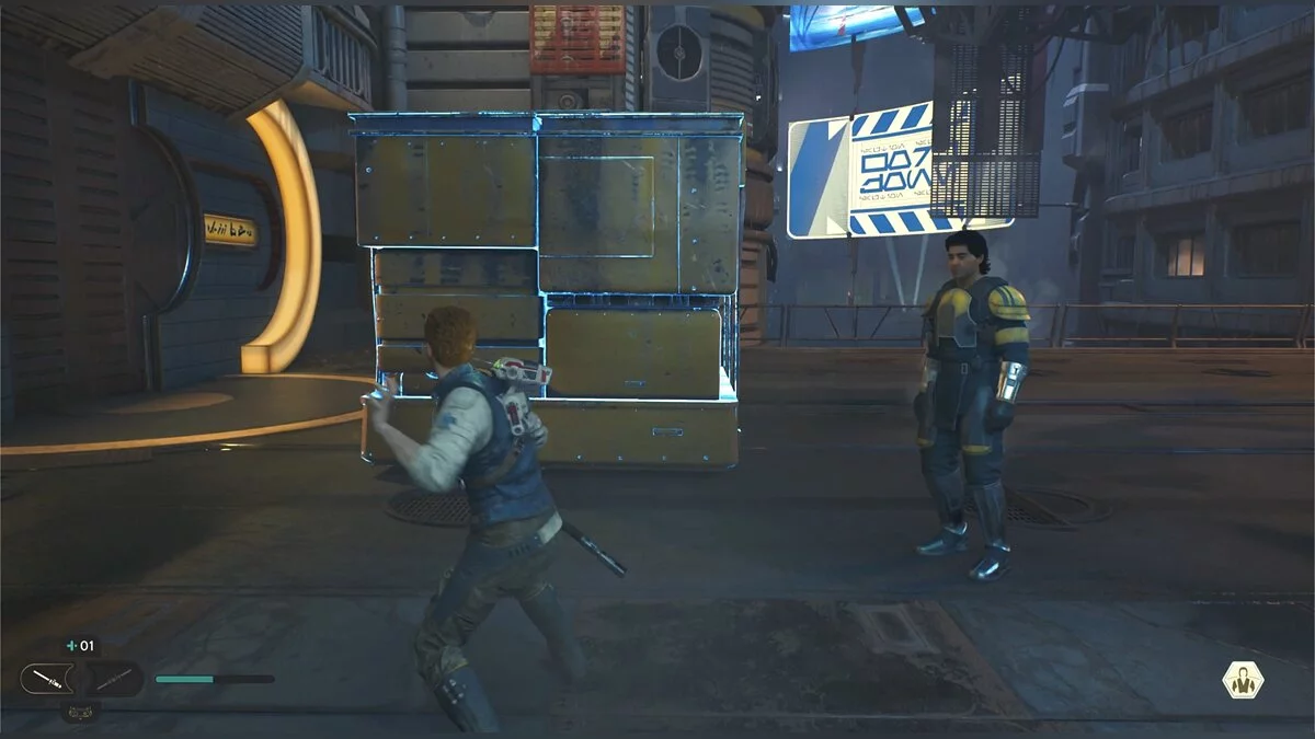 Сверьтесь с картой, чтобы понять куда идти. Навстречу выйдет группа солдат. В следующей зоне попросите Боуда опустить платформу, а затем подтолкните Силой ящик, чтобы забраться на нее.