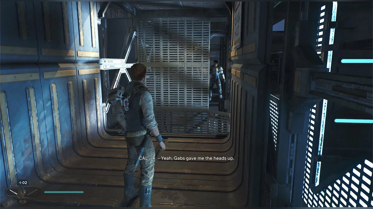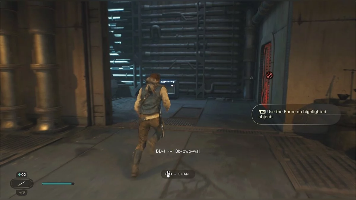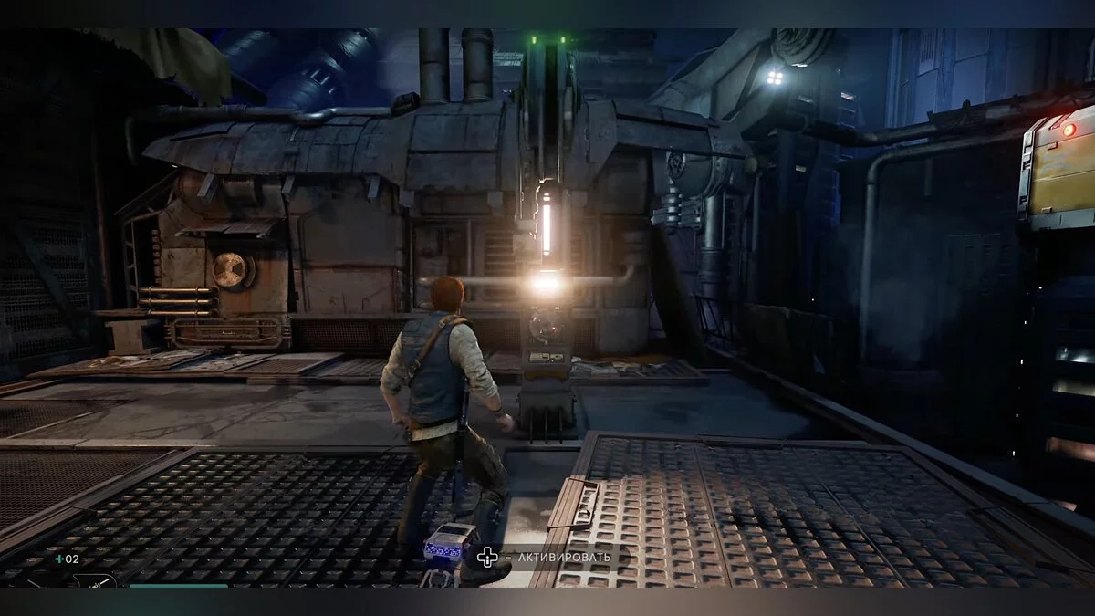 Слева опустите Силой металлическую конструкцию и лезьте вверх. Запустится кат-сцена, после которой к вам присоединится новый товарищ — Боуд. Он может помогать в бою, а также выполняет поручения Кэла в определенных местах, чтобы помочь продвинуться дальше. В такие моменты на экране будет соответствующая кнопка.