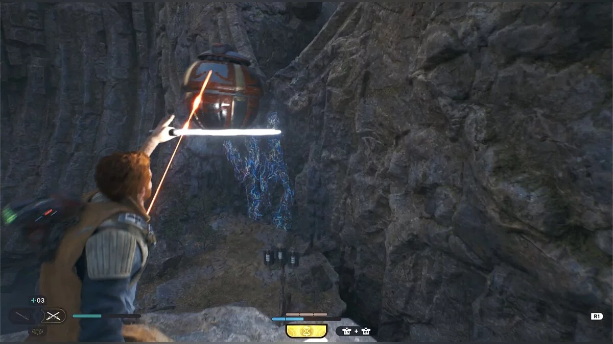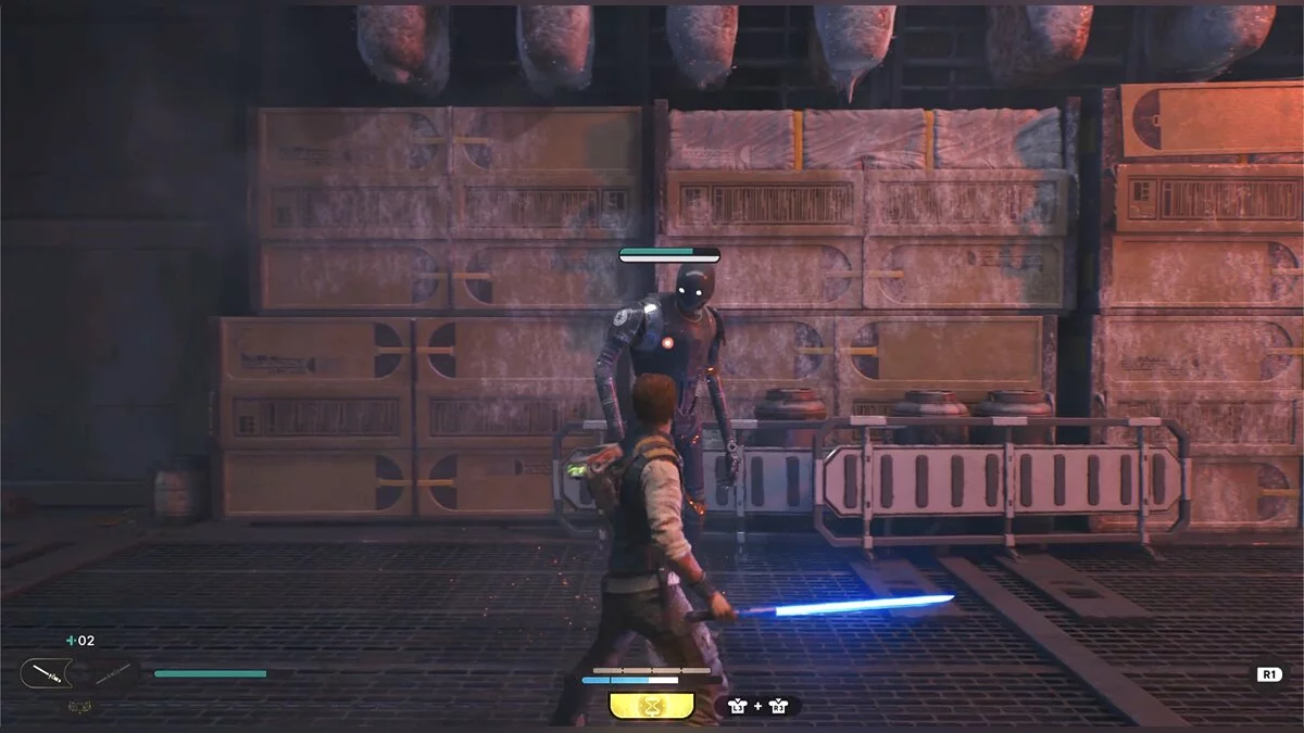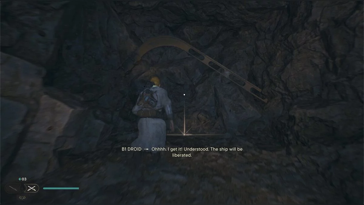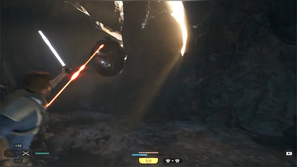 Идите вглубь пещеры и столкнетесь с новым врагом — подвижным дроидом. Старайтесь поймать его на парировании.