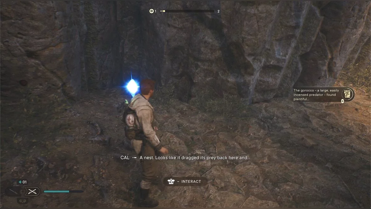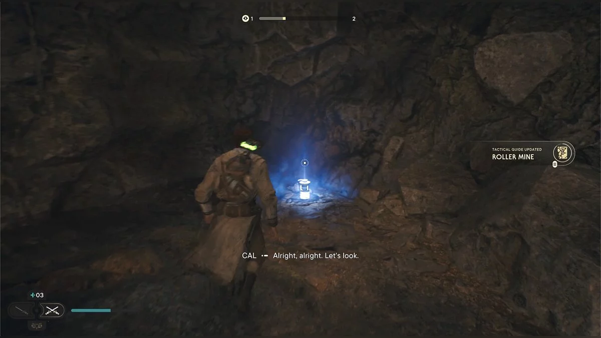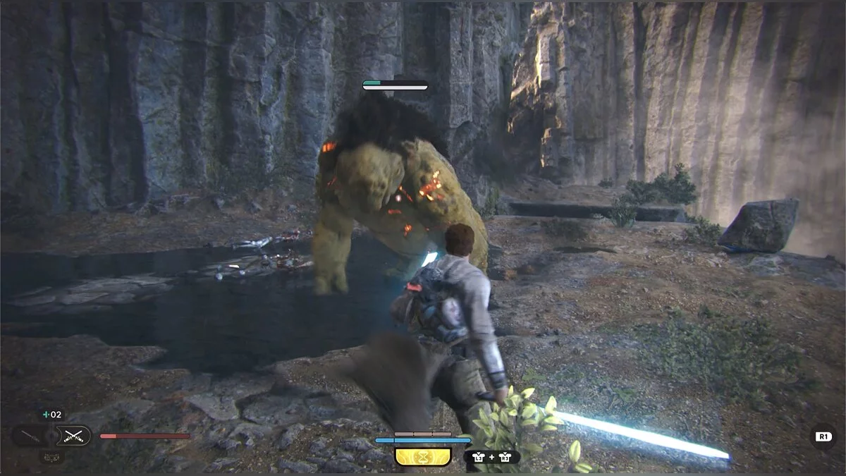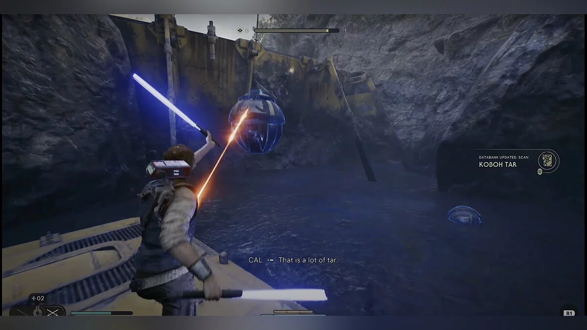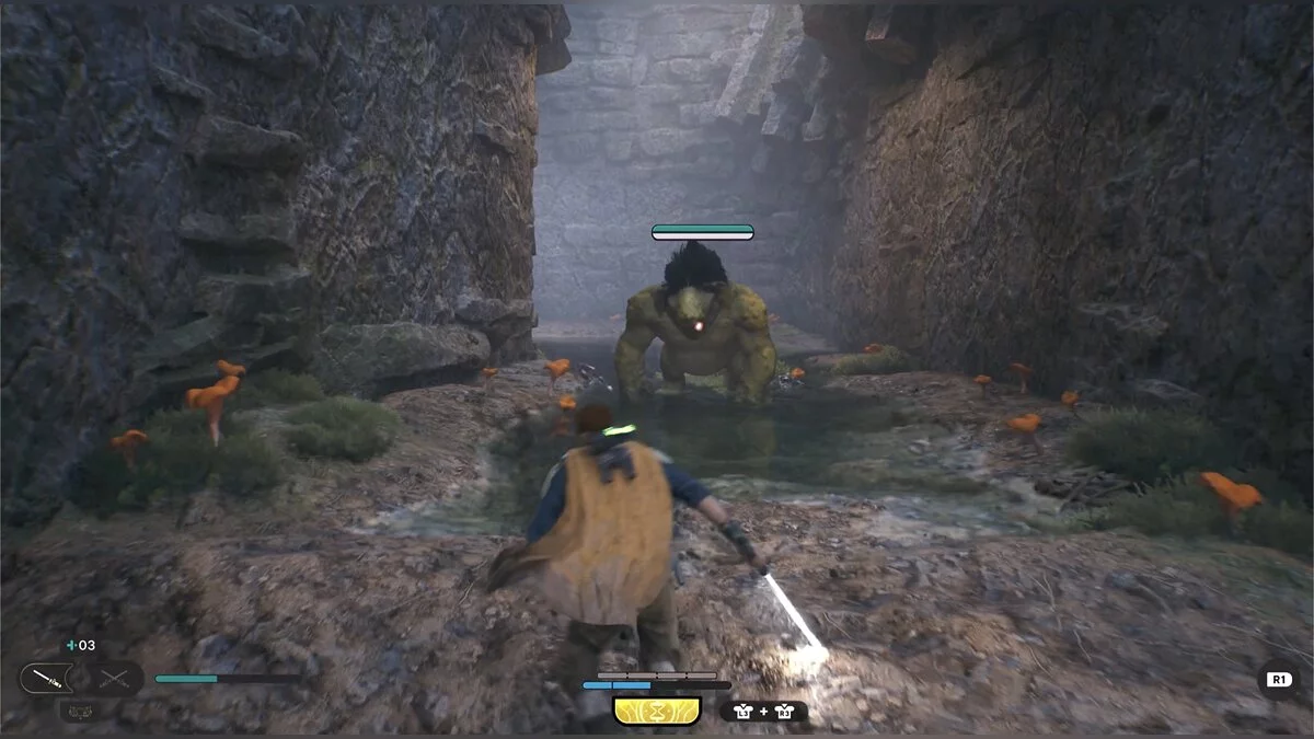 Идите вглубь пещеры и столкнетесь с новым врагом — подвижным дроидом. Старайтесь поймать его на парировании.