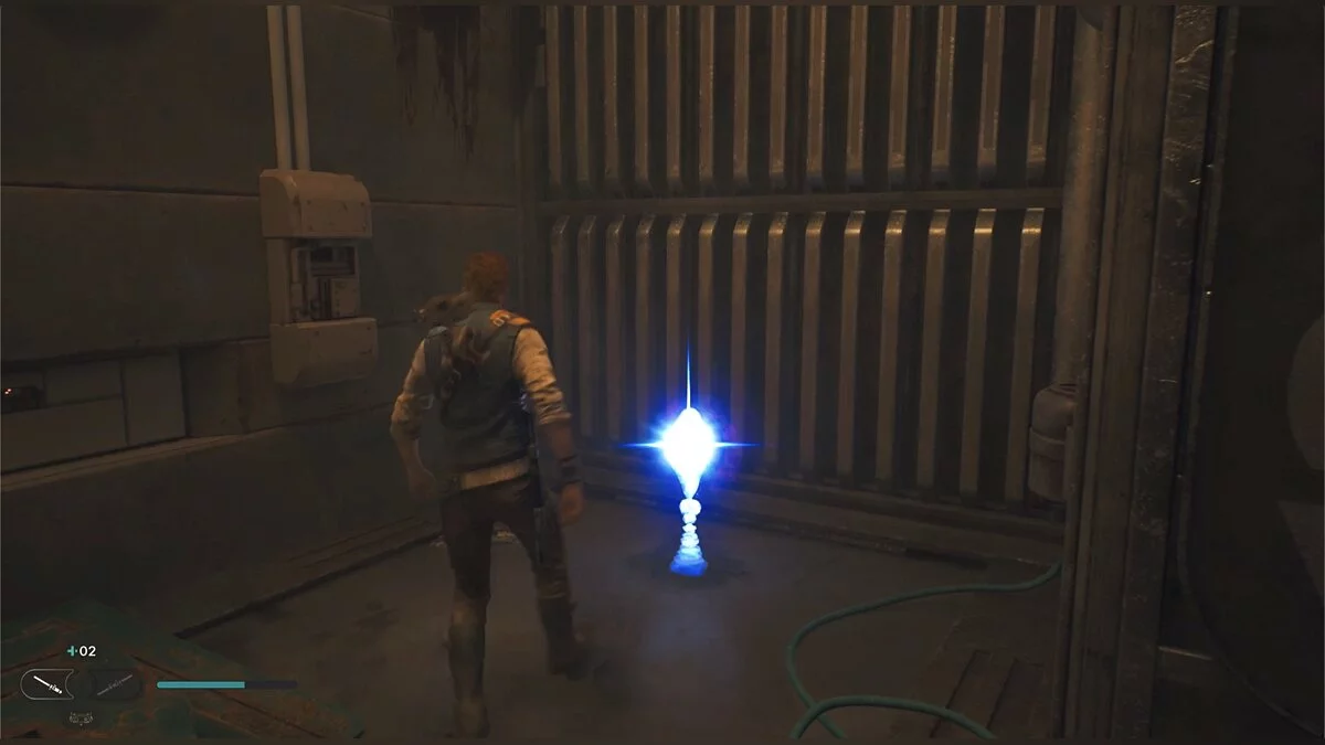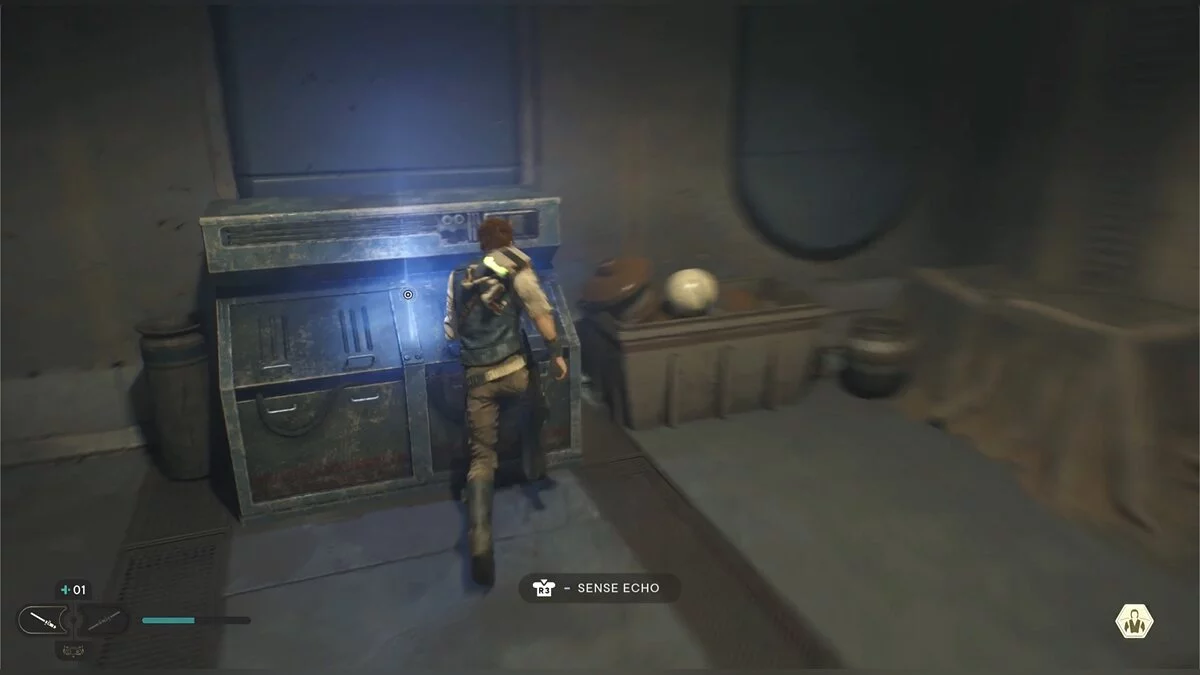 От круга поверните налево. Перед вами будет закрытая дверь, а еще левее светящийся предмет в углу — это эхо Силы и один из предметов, которые можно подбирать в ходе исследований.