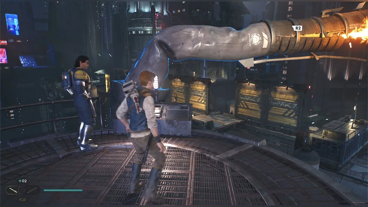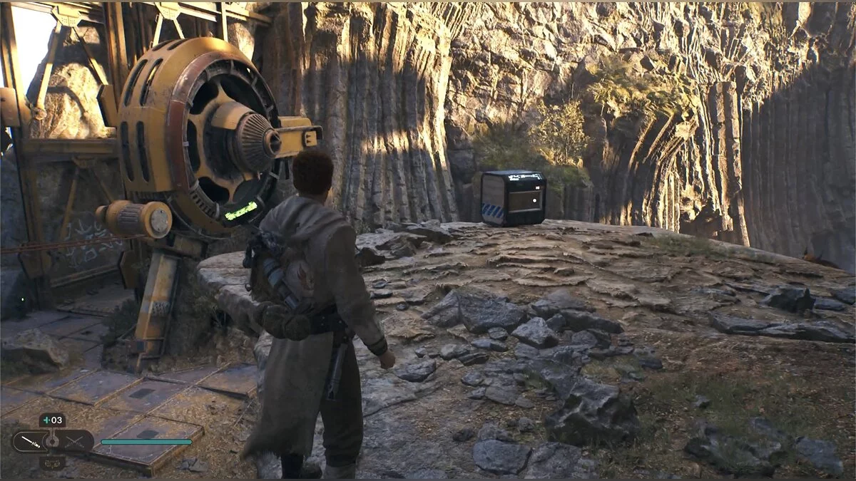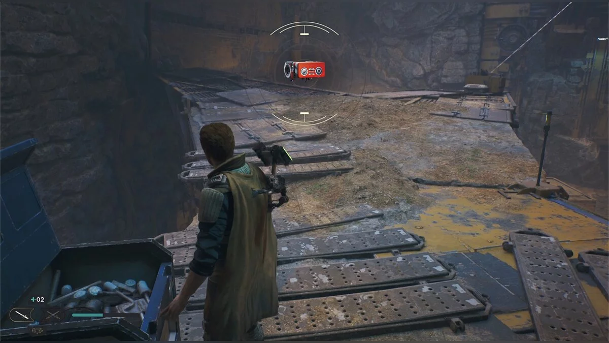 Продолжайте движение вперед, пока не окажетесь на открытой платформе. Слева есть устройство, выстреливающее канат на противоположную сторону, однако мешает контейнер. Попросите Боуда сбить его, и с помощью дроида переместитесь на противоположную сторону.