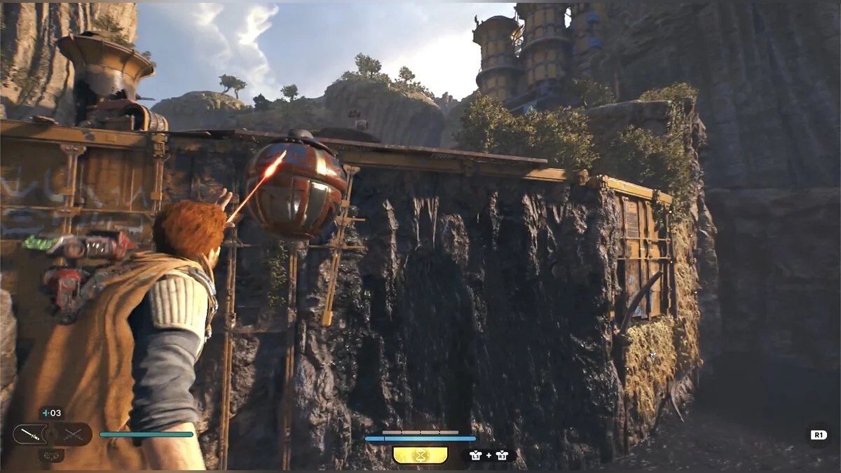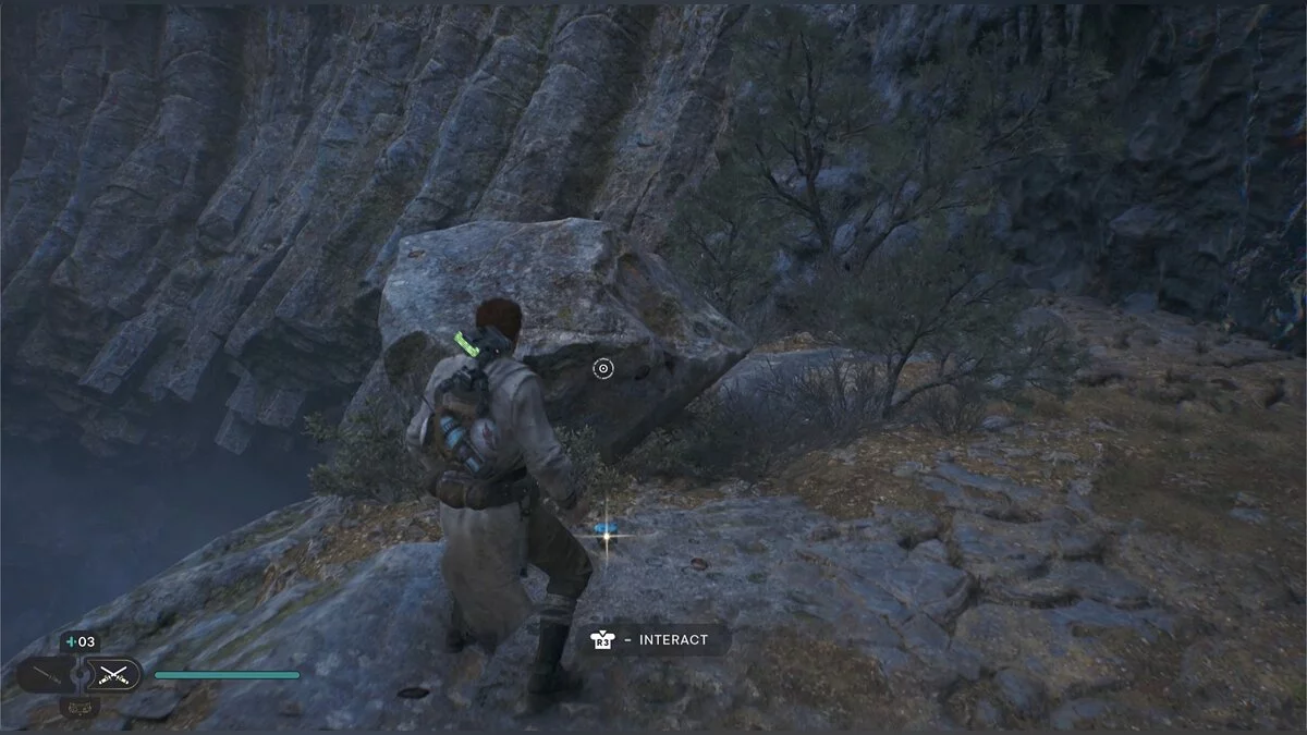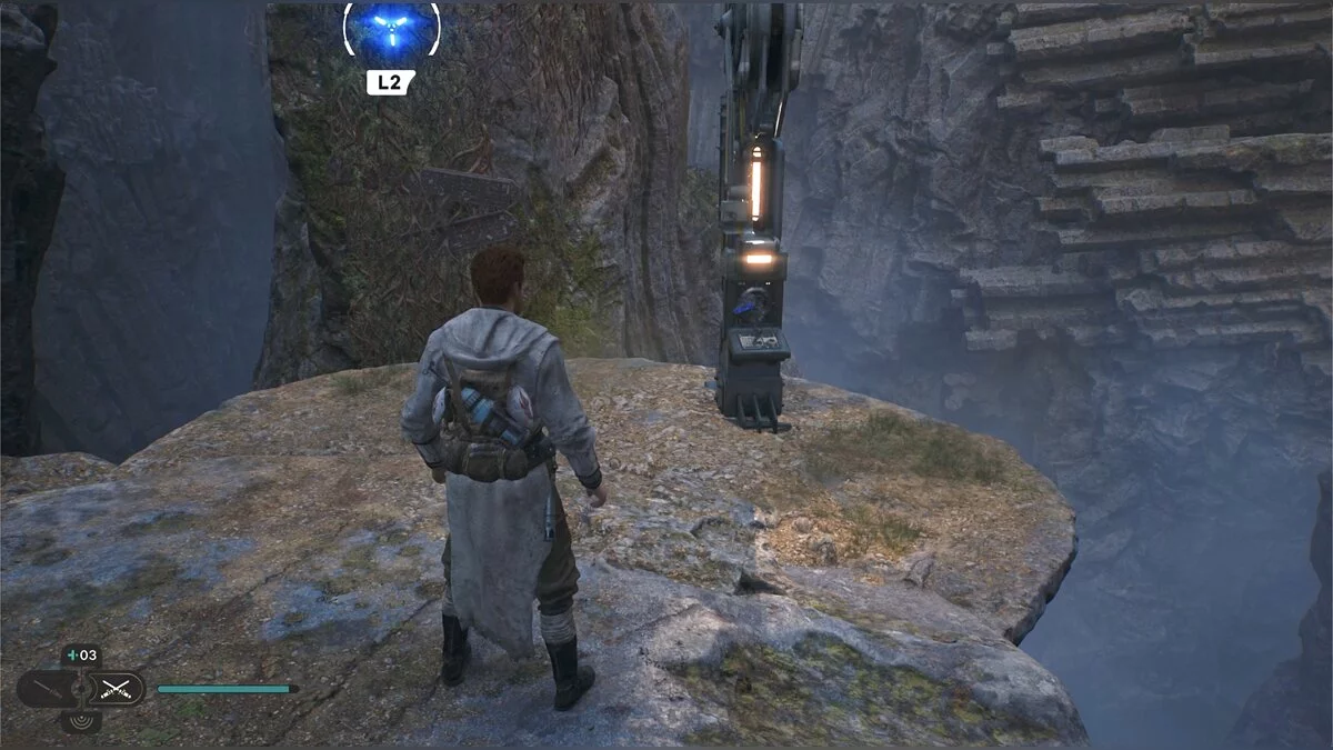 Справа есть лифт, спуститесь на нем. Активируйте круг медитации и осмотритесь. Слева есть скала, на которую можно забраться с помощью крюка — ящик с деталью для дроида.