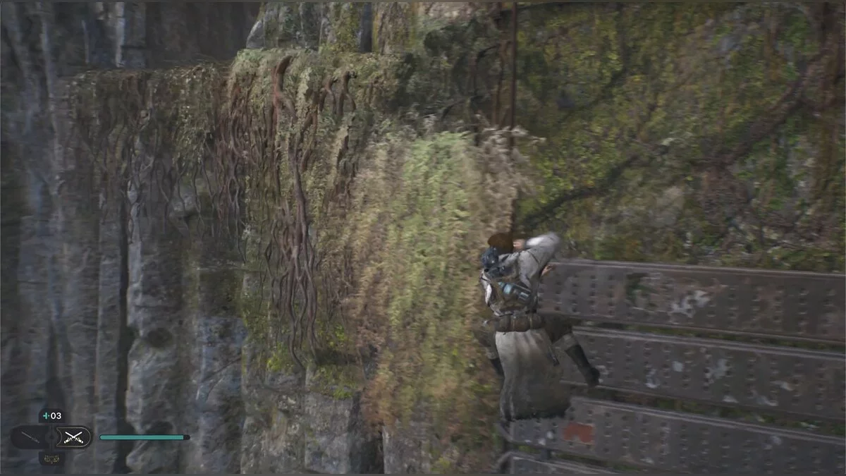 Прыгните на трубу и подойдите к устройству справа, чтобы сделать короткий путь. Зацепитесь крюком за скалу и лезьте по лианам. Вы увидите рейдеров и дроидов. Убейте их, заберитесь на уступ, пробегите по стене.