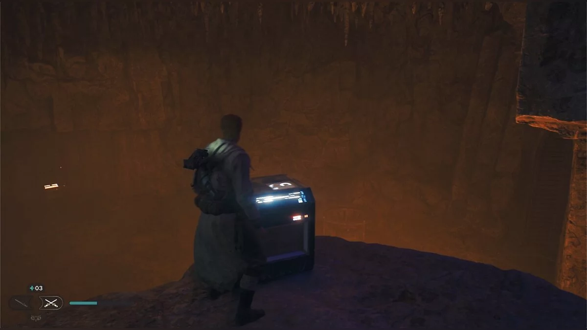 Теперь идите по основному пути от лифта налево. Пробегите по стене, перепрыгните пропасть и столкнетесь с дроидами времен Войны клонов. Разобравшись с ними, заходите в пещеру и сразу же поверните в левый проход. Пробегите по стене, чтобы забраться на уступ и подобрать сокровище.