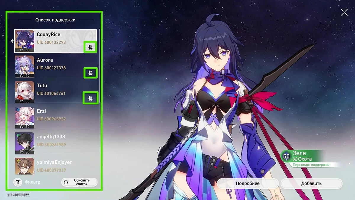 В правой части экрана вы увидите надпись «Поддержка». Кликните на неё, чтобы открыть доступных героев поддержки поблизости или из списка ваших друзей. Герои друзей помечены специальным значком.