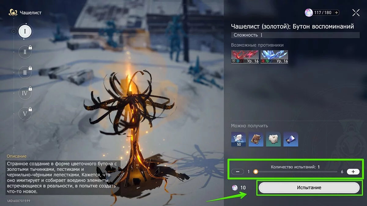 Когда будете готовы, телепортируйтесь к Чашелисту и взаимодействуйте с ним. Установите нужное количество испытаний и нажмите на клавишу «Испытание».