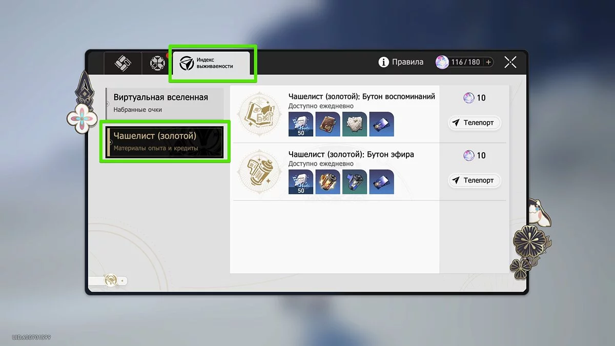 Вы также можете отследить доступность Чашелистов через меню Путеводителя межзвёздного мира (клавиша «F4» на ПК) во вкладке «Индекс выживаемости». Стоит отметить, что для выполнения испытаний Чашелиста потребуется потратить определённое количество энергии Освоения.