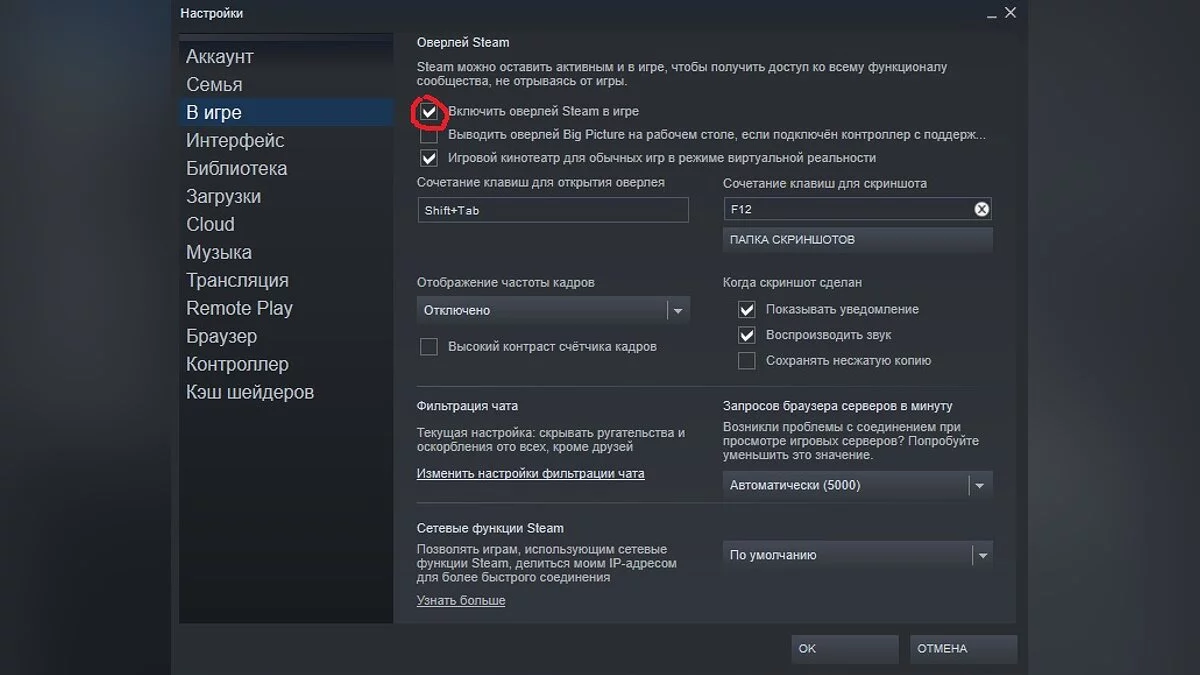 - Уберите галочку в пункте «Включить оверлей Steam в игре»;
