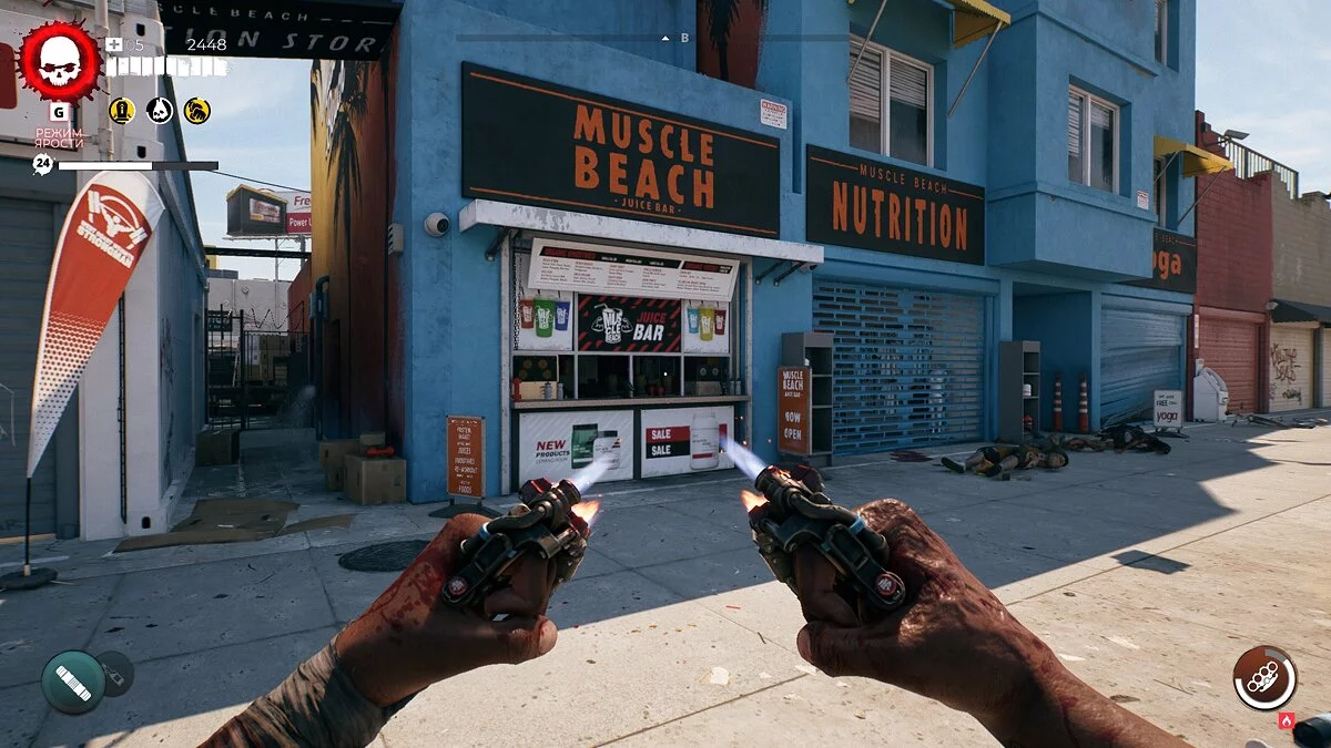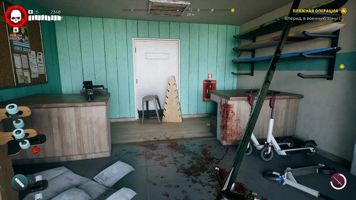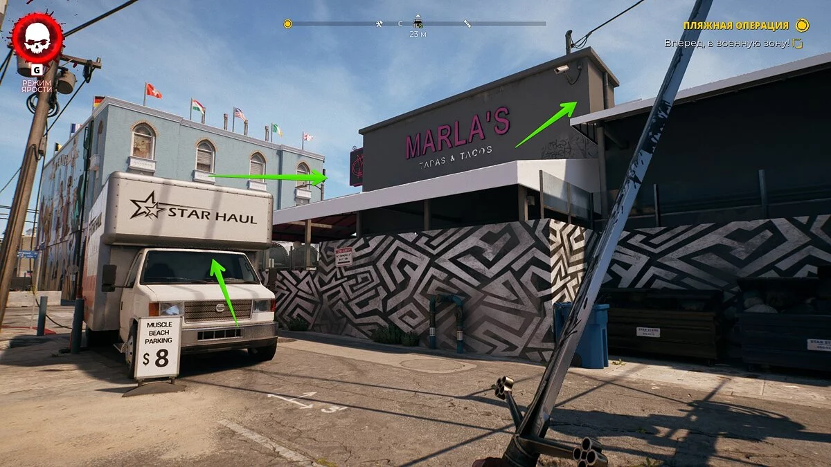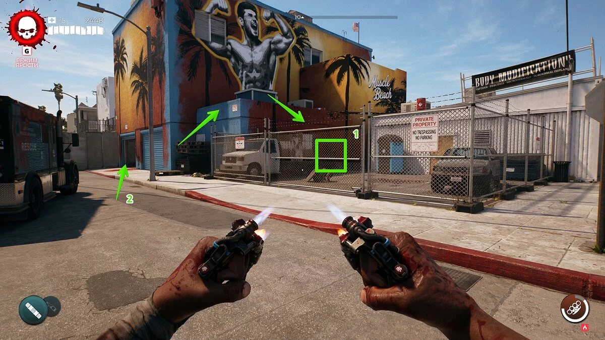 Теперь бегите на юг до магазина Muscle Beach. Дверь будет заперта, поэтому вам придётся решить небольшую головоломку, чтобы пробраться внутрь. Мы уже рассказывали, как сделать это.