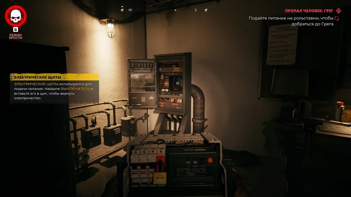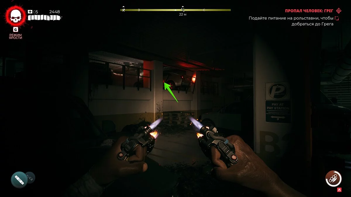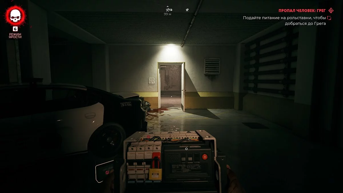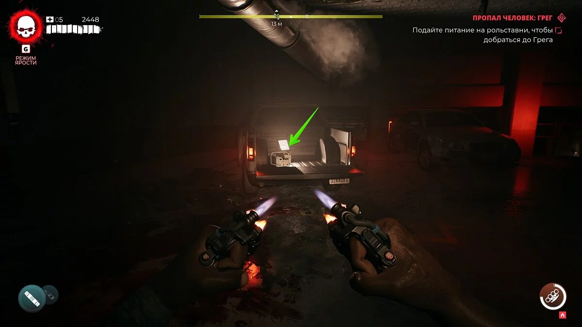 Разрушьте деревянные коробки и вызовите лифт. Спуститесь на подземную парковку и подойдите к решётке, чтобы поболтать с Грегом. По окончании диалога поднимитесь по паллетам справа и в багажнике пикапа найдите выключатель.