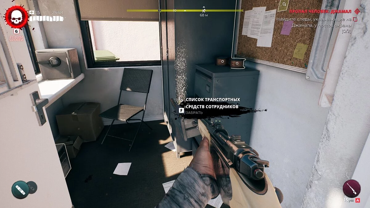 Переместитесь к отелю «Гальперин» и выйдите из здания. На парковке вы можете обнаружить сторожку охранника. Избавьтесь от магнитных замков и заберите первую заметку.