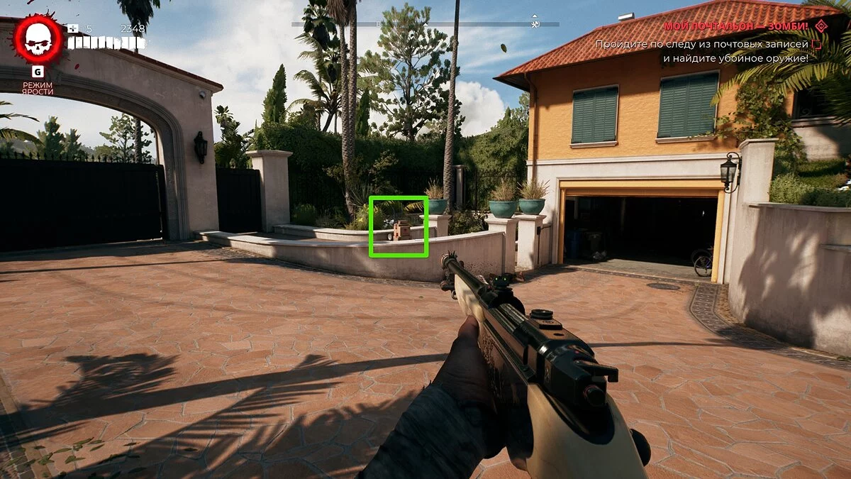 Для начала отправляйтесь в стартовый особняк, в котором вы бывали в самом начале игры. Точнее, придётся пройти к гаражу и осмотреть посылки слева от него.