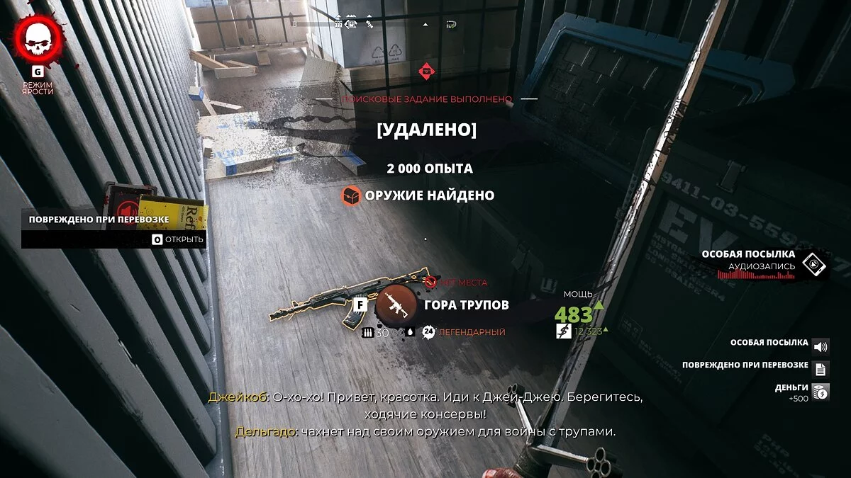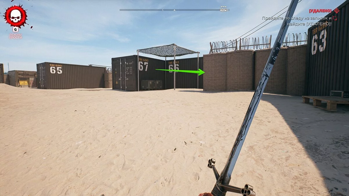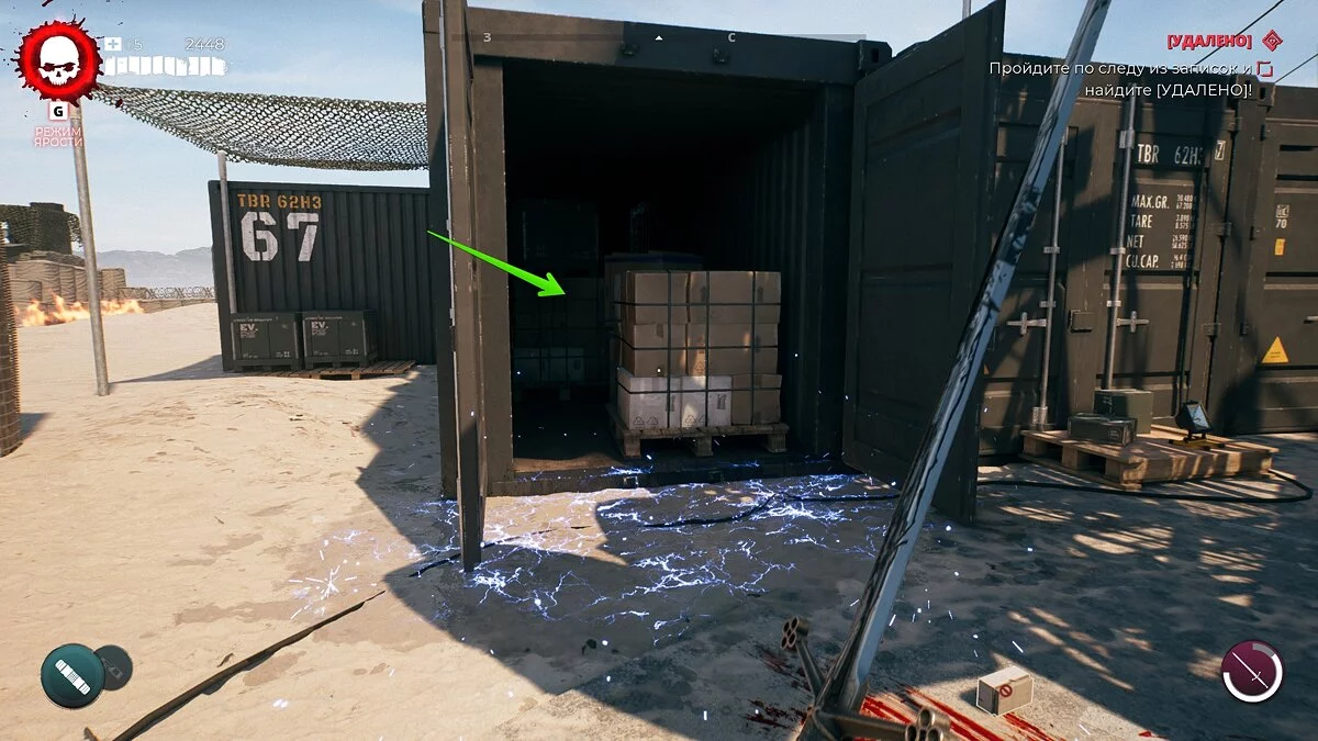 Забирайтесь в открытый контейнер и найдите тайник. Перед этим придётся разломать несколько ящиков.