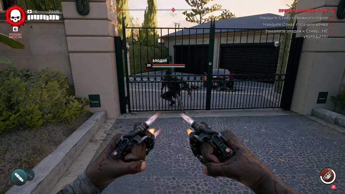 Выйдите на дорогу и откройте ворота соседнего дома. Здесь ждёт идеальный злодей.