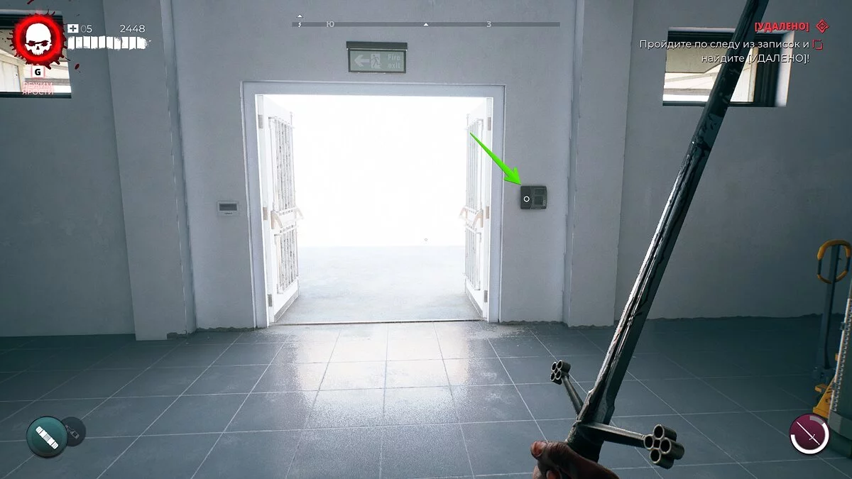 Спуститесь на первый этаж и просто следуйте за маркером в восточную часть локации. Осмотрите запертое здание. Войти можно через приоткрытые ворота с правой стороны.
