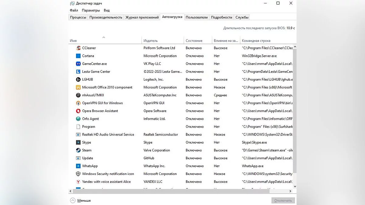 На сегодняшний день существует множество программ, которые загружаются при запуске системы. Чтобы уменьшить нагрузку на процессор, вы можете отключить всё лишнее. Для этого откройте «Диспетчер задач» и перейдите в раздел «Автозагрузка». Отследите здесь сторонние приложения и отключите их. Если вы не планируете пользоваться той или иной программой в дальнейшем, то есть повод задуматься о его удалении.