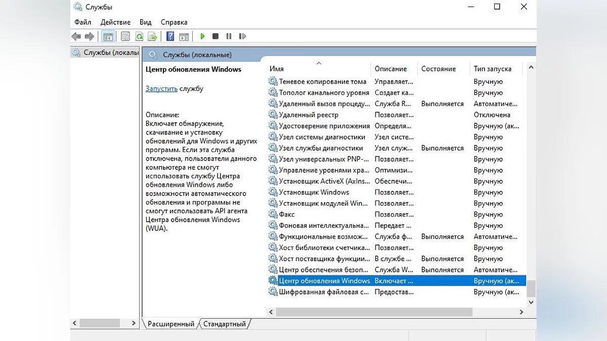 Для этого откройте строку «Выполнить» используя «Win+R» или меню «Пуск», и введите «services.msc» без кавычек. В новом окне в конце списка найдите и откройте раздел с названием «Центр обновления Windows», чтобы изменить тип запуска и состояние.