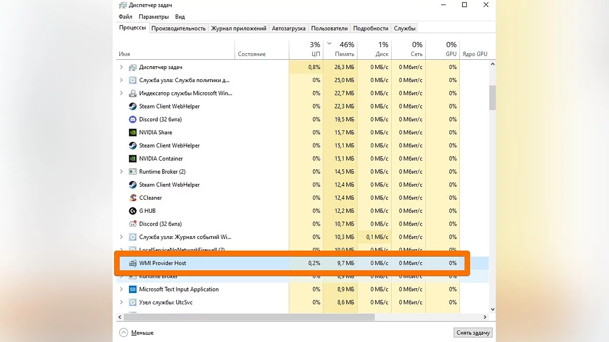 Проверьте системный инструмент WMI Provider Host (WmiPrvSE.EXE)