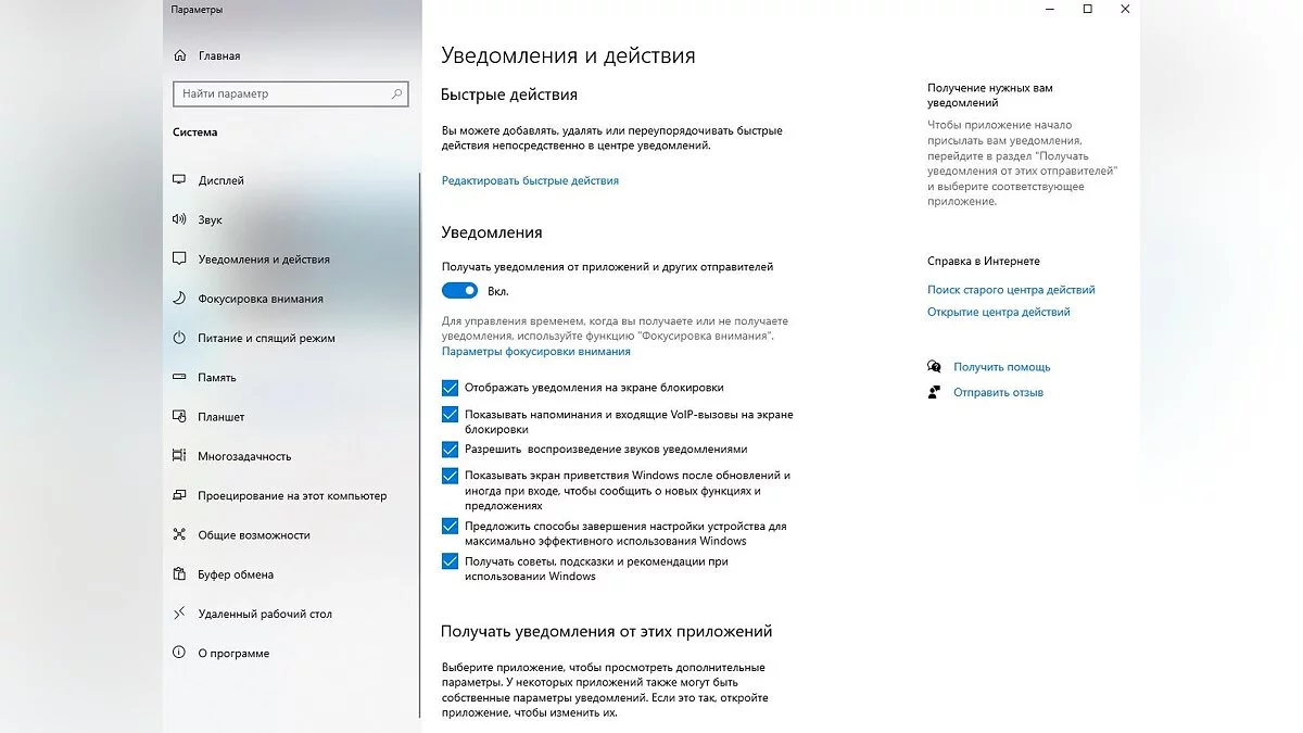 Ещё одна функция в Windows 10/11, которая может выйти из-под контроля. Откройте приложение «Параметры» через меню «Пуск» или используя окно поиска. Затем перейдите во вкладку «Система». Выберите раздел «Уведомления и действия» и смело отключите всё, чем вы не пользуетесь. Если это не помогло, можете выключить все доступные функции.