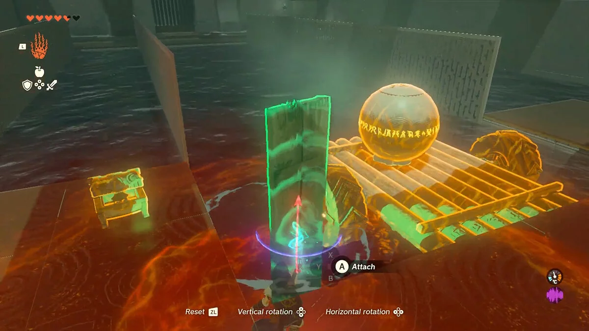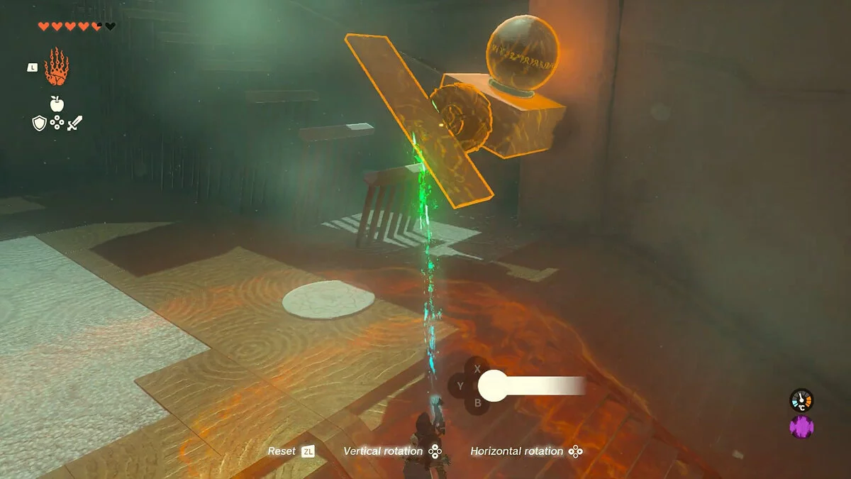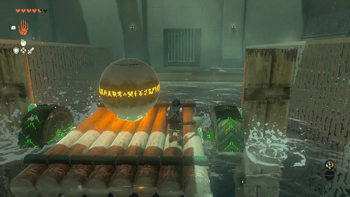Решить головоломку довольно просто: при помощи способности Ultrahand захватите шар и положите его на «машину». Теперь используйте любое оружие и ударьте по одному из колёс, чтобы активировать устройство.