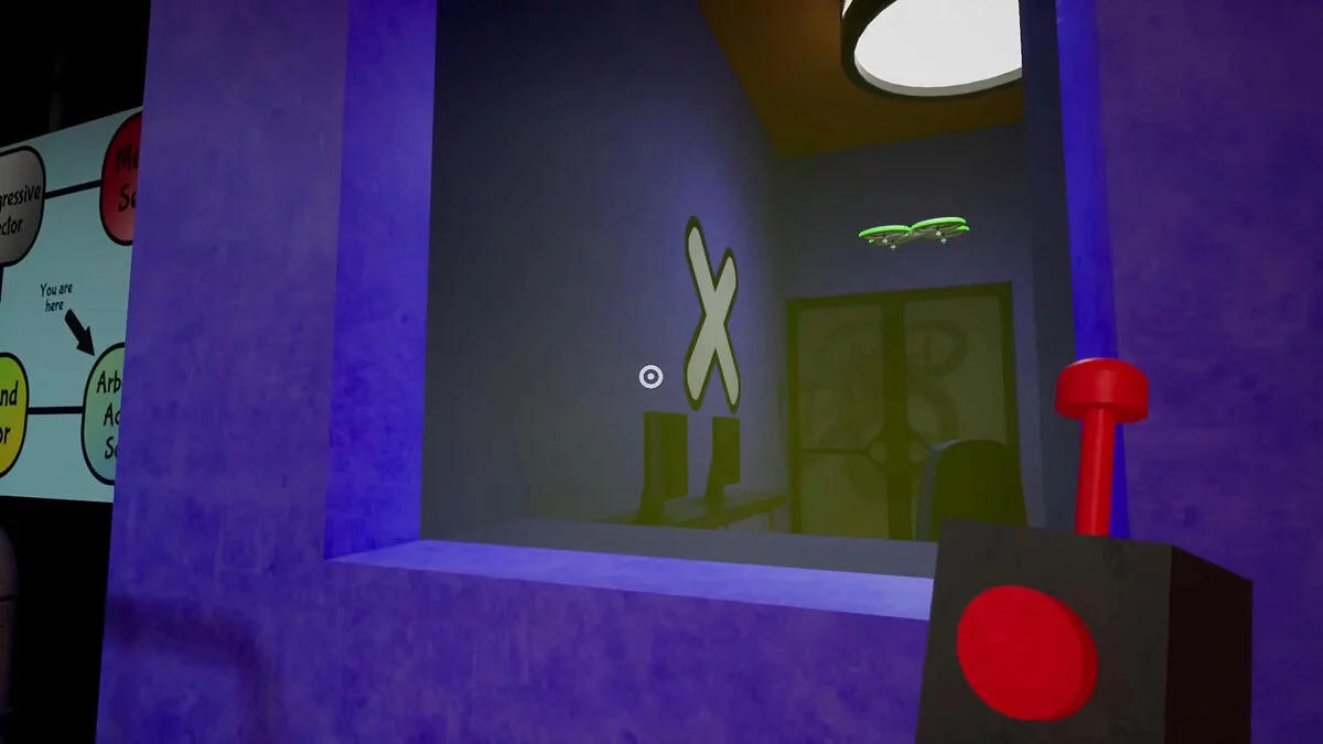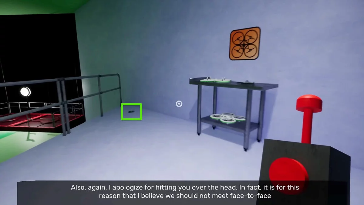 Теперь вы можете управлять дроном. Дайте команду добраться до двух больших кнопок рядом с зелёной дверью. Так вы сможете пройти в соседнюю комнату и получить две ключ-карты.