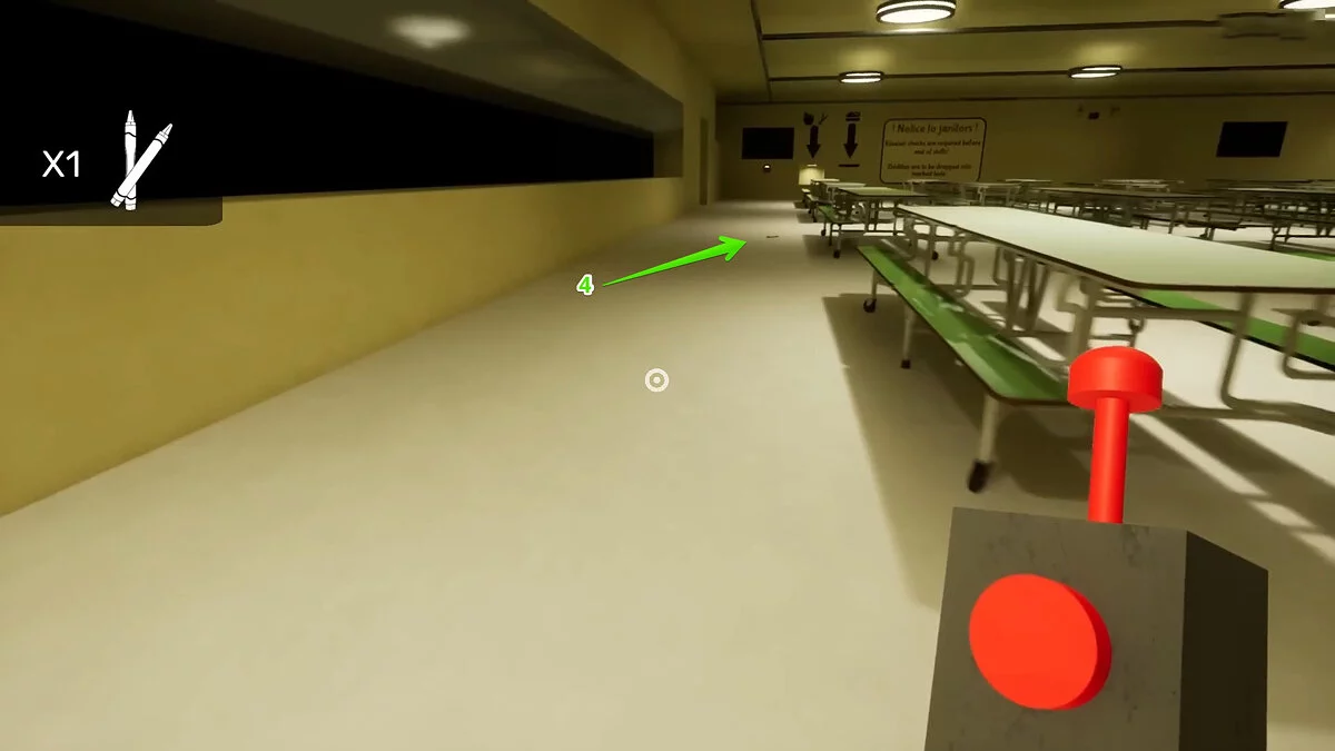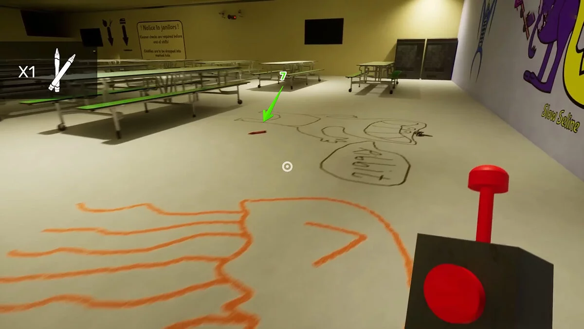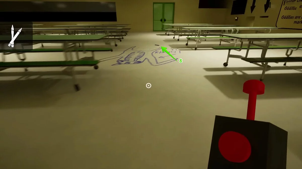 Игрок увидит разбросанные по полу фломастеры. Соберите их все и поместите в специальное окно. Всего их восемь.