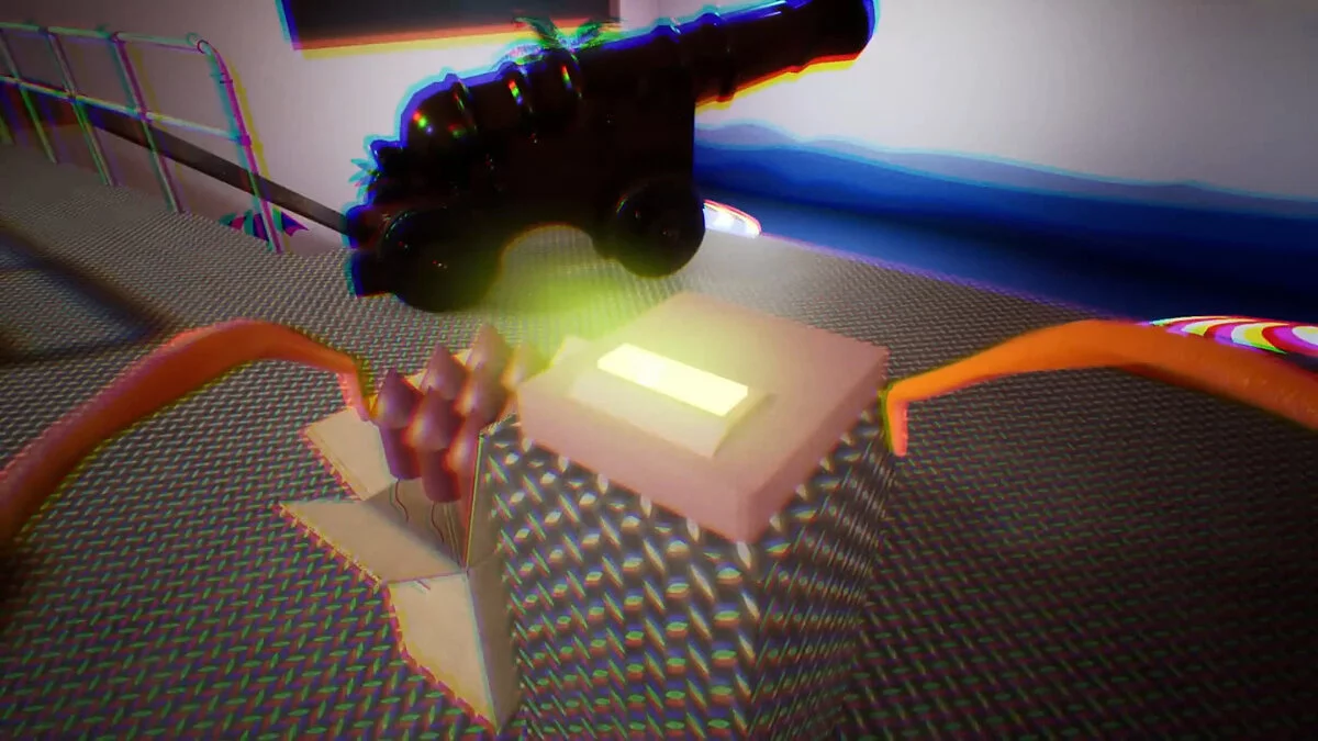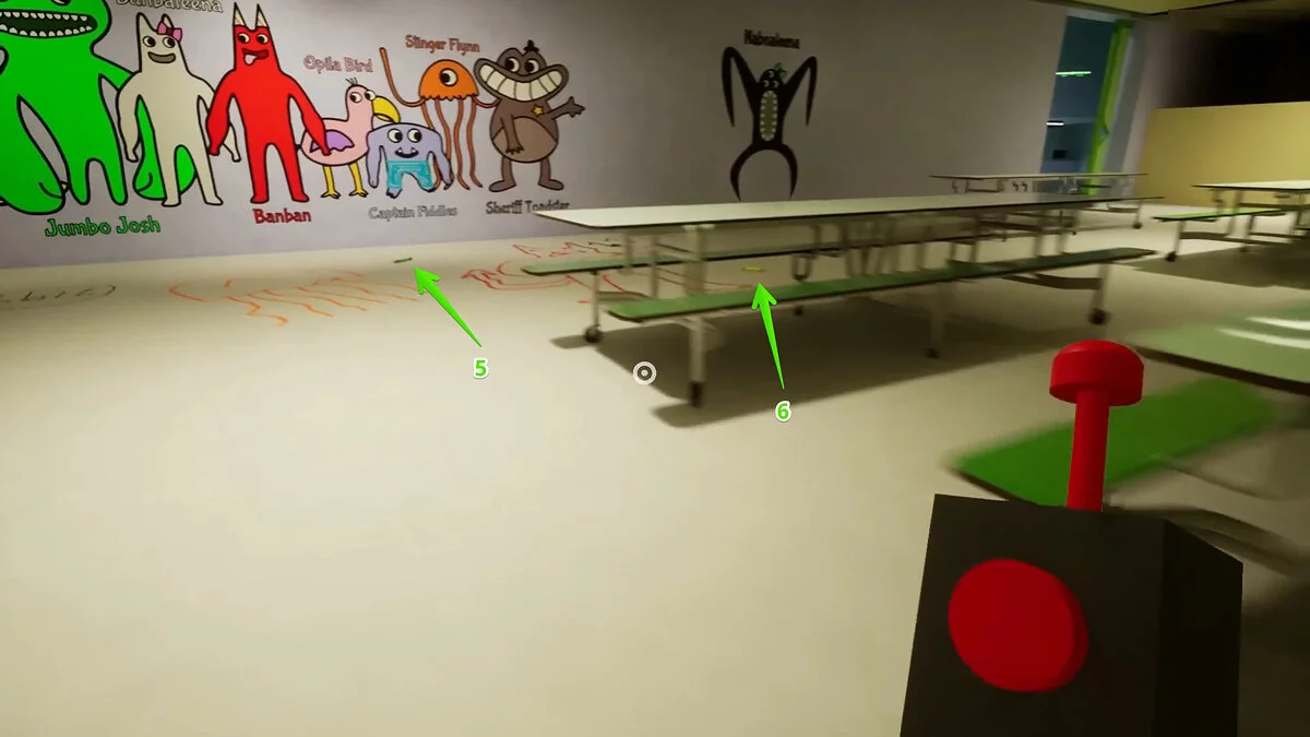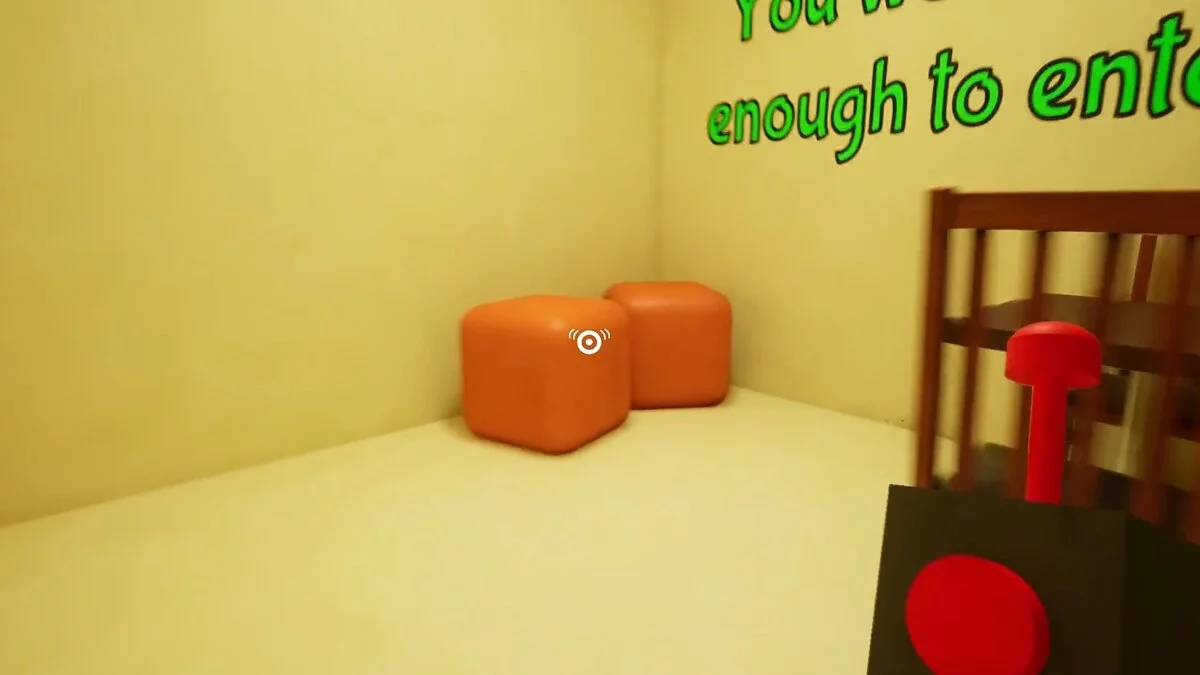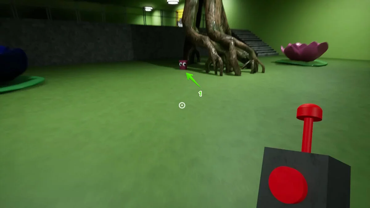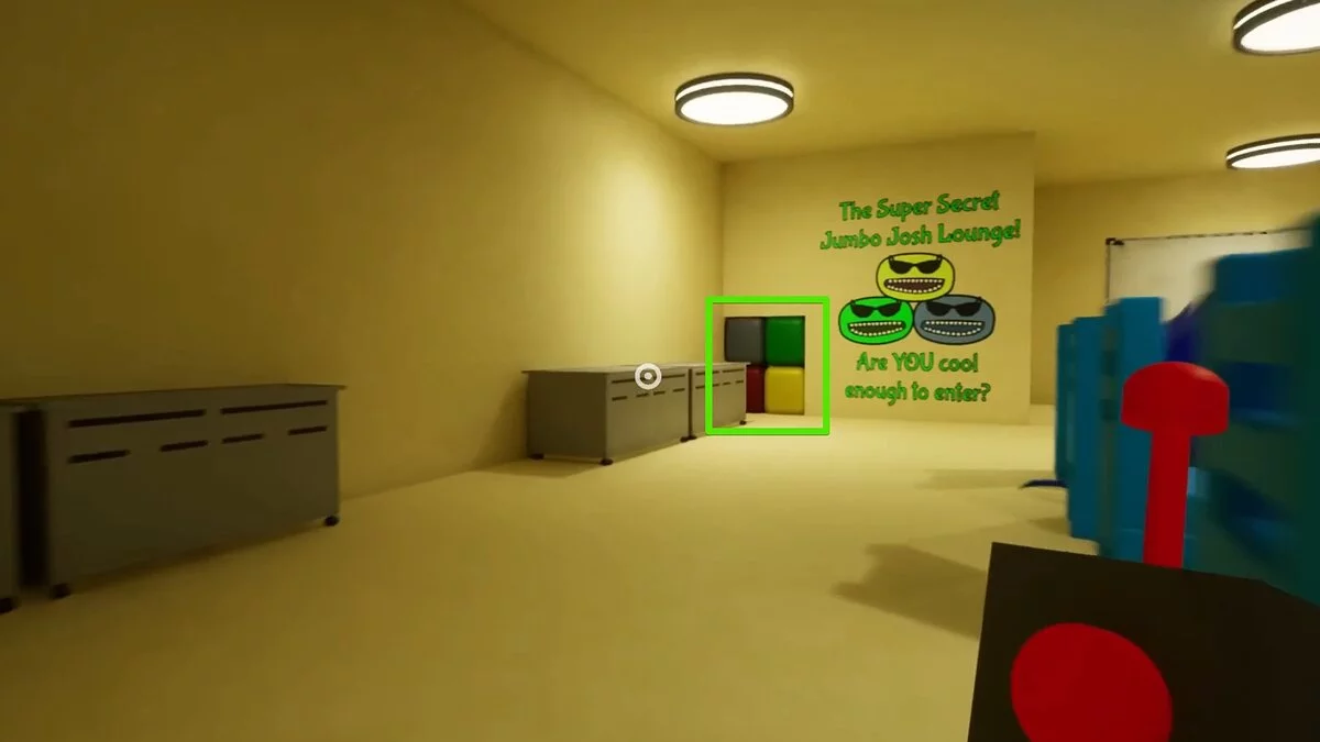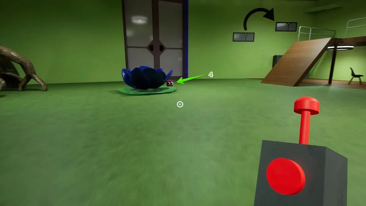 Вы окажетесь за столом с одним из монстров. Слезайте и бегите к стене с граффити. Слева есть четыре кубика — нажмите на них, чтобы открыть проход и забрать два красных куба.