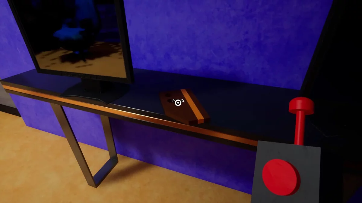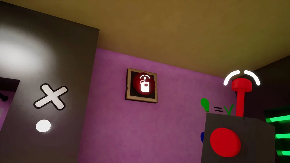 Когда поместите все фломастеры в окно, нажмите на кнопку под монитором и дождитесь, пока появившееся устройство не скроется в противоположной части комнаты. В этот момент появится фиолетовая ключ-карта.