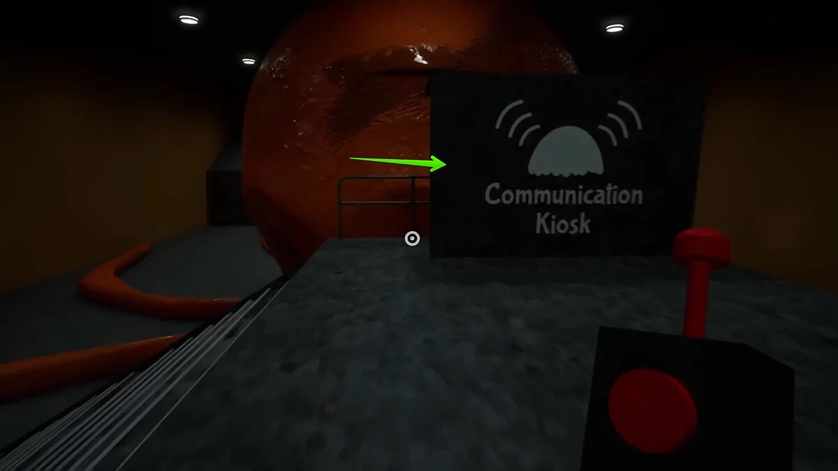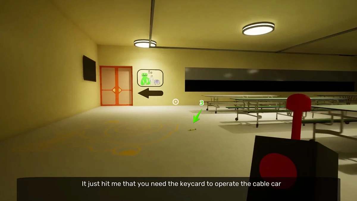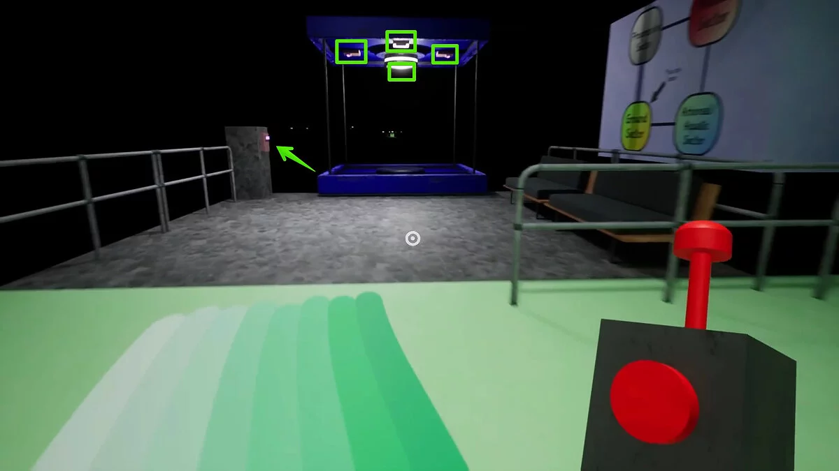 Вернитесь в предыдущее помещение и найдите лифт синего цвета. Взаимодействуйте со считывателем карт и посмотрите на потолок лифта. Каждое устройство отвечает за направление движения импровизированного фуникулера.