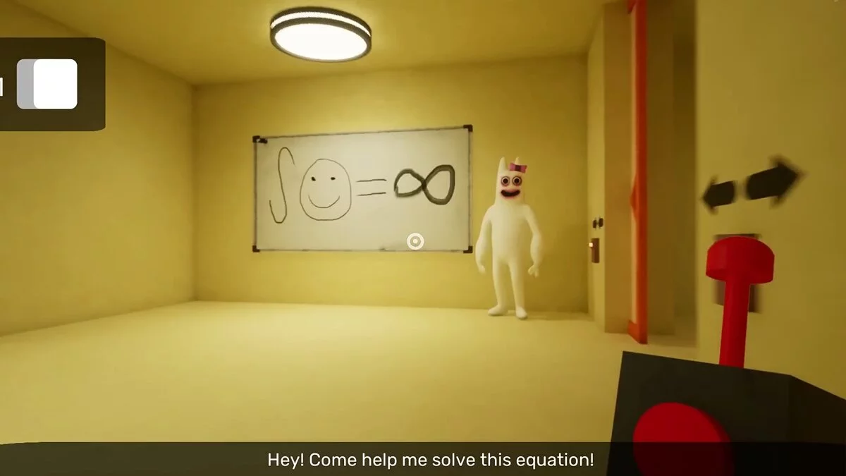 В предыдущей комнате на доске появятся несколько рисунков. Сотрите их все и садитесь за стол. Если этого не сделать, босс заметит изменения и вам придётся начинать заново. После небольшой сцены поставьте два куба перед третьей дверью, заберитесь на них и перепрыгивайте через стену.