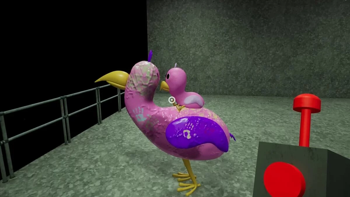 Пройдите в открывшуюся дверь и нажмите на выключатель рядом с разноцветной птицей. Перед этим можете посадите птенца ей на спину.