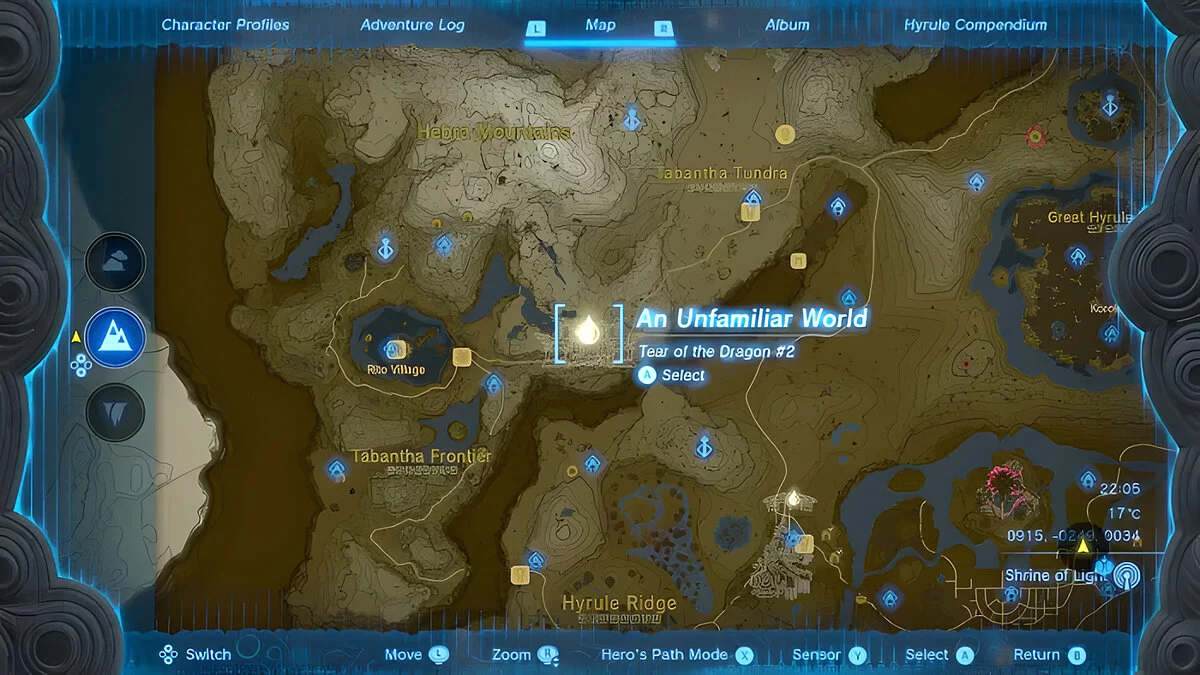 Геоглиф «Незнакомый мир» (An Unfamiliar World) спрятан в локации Хебра (Hebra) к северо-западу от Башни Линдора Броу Скайвью. Слеза находится около верхней части.