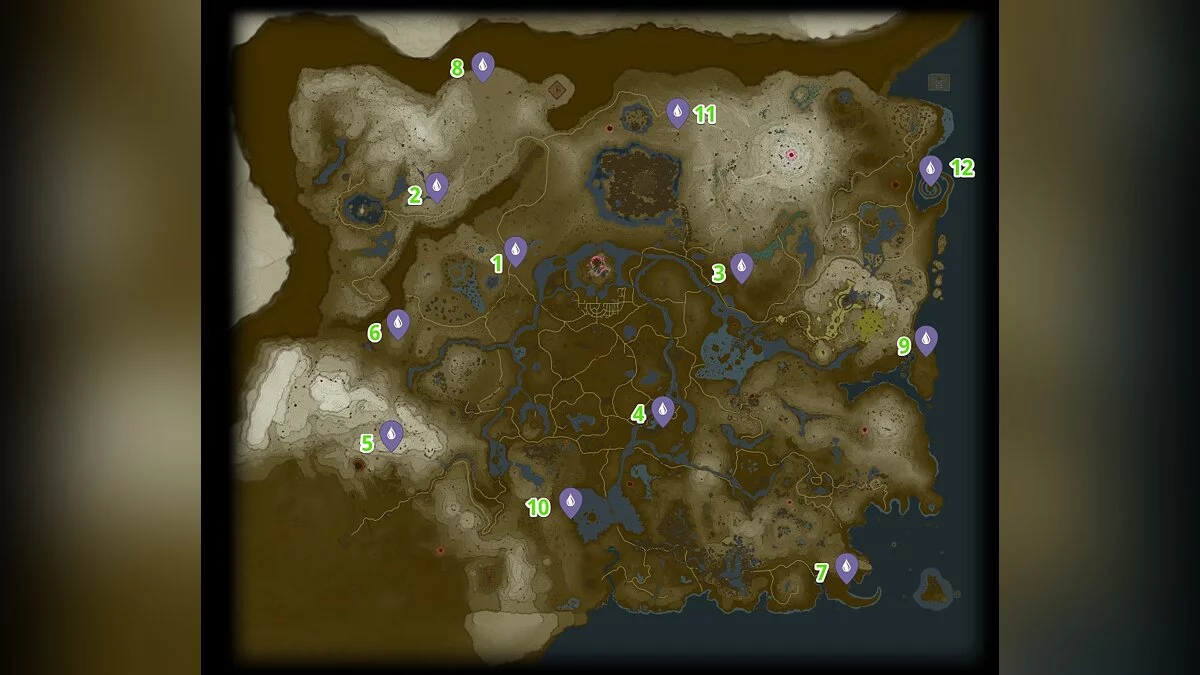 Ниже мы указали карту расположения геоглифов в The Legend of Zelda: Tears of the Kingdom. Каждому из них присвоен номер, отображаемый в игре, поэтому мы также пронумеровали их. Эти числа относятся к воспоминаниям, которые вы сможете посмотреть после нахождения. Если вам важно увидеть все воспоминания в правильной последовательности, то активируйте геоглифы в таком же порядке.