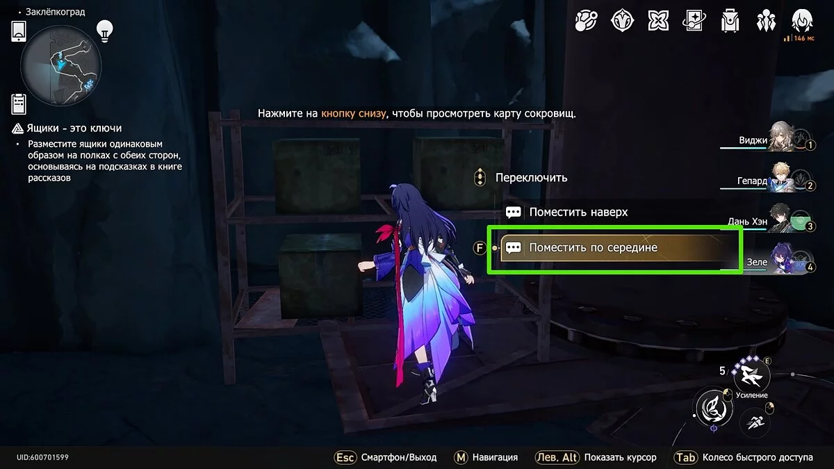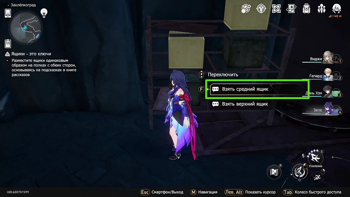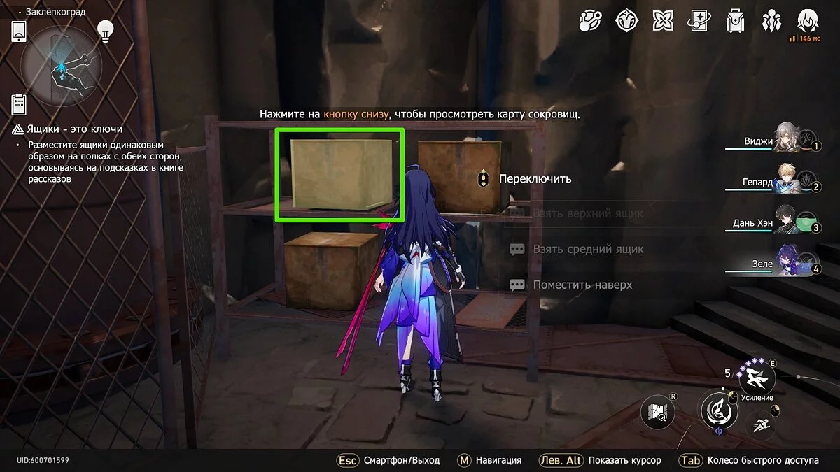 Немного правее вы обнаружите две подставки для ящиков. На стеллаже слева стоит четыре ящика, а на правом — два. Подойдите к левой стойке и заберите средний ящик, чтобы разместить на правой полке. Затем возьмите ящик сверху и поставьте его на место, где стоял предыдущий.