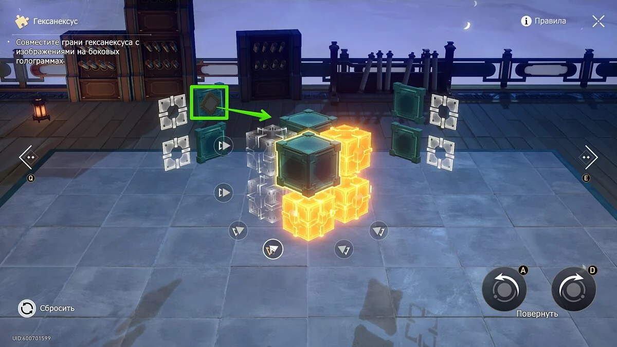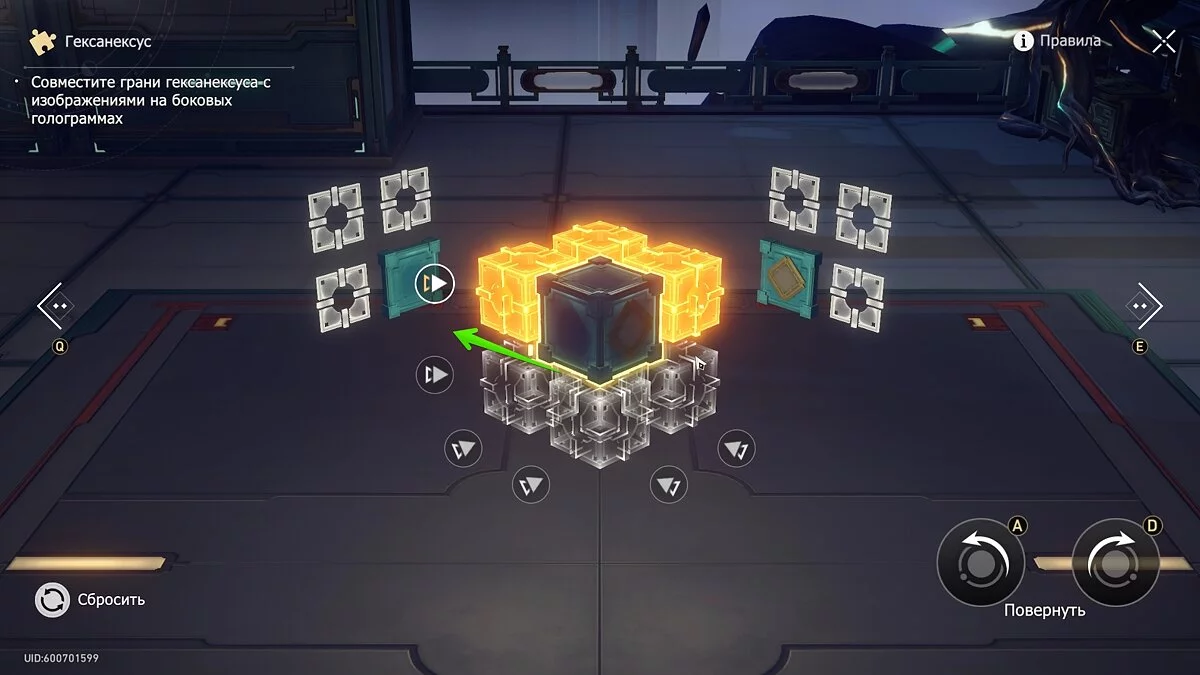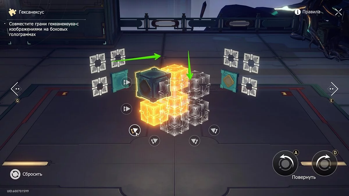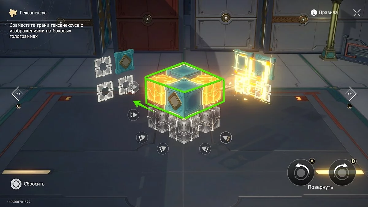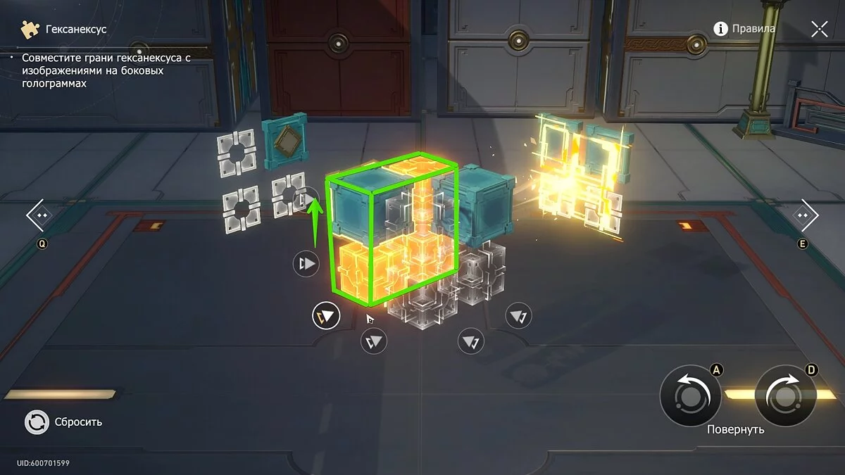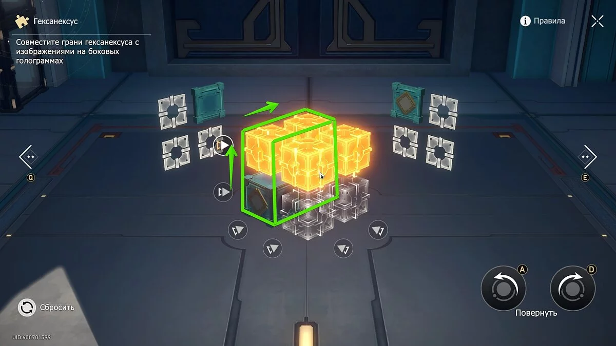 От предыдущего места телепортируйтесь в правую часть карты и взаимодействуйте с кубом. Дальний левый блок поверните вверх дважды, чтобы блок с узором встал на своё место.