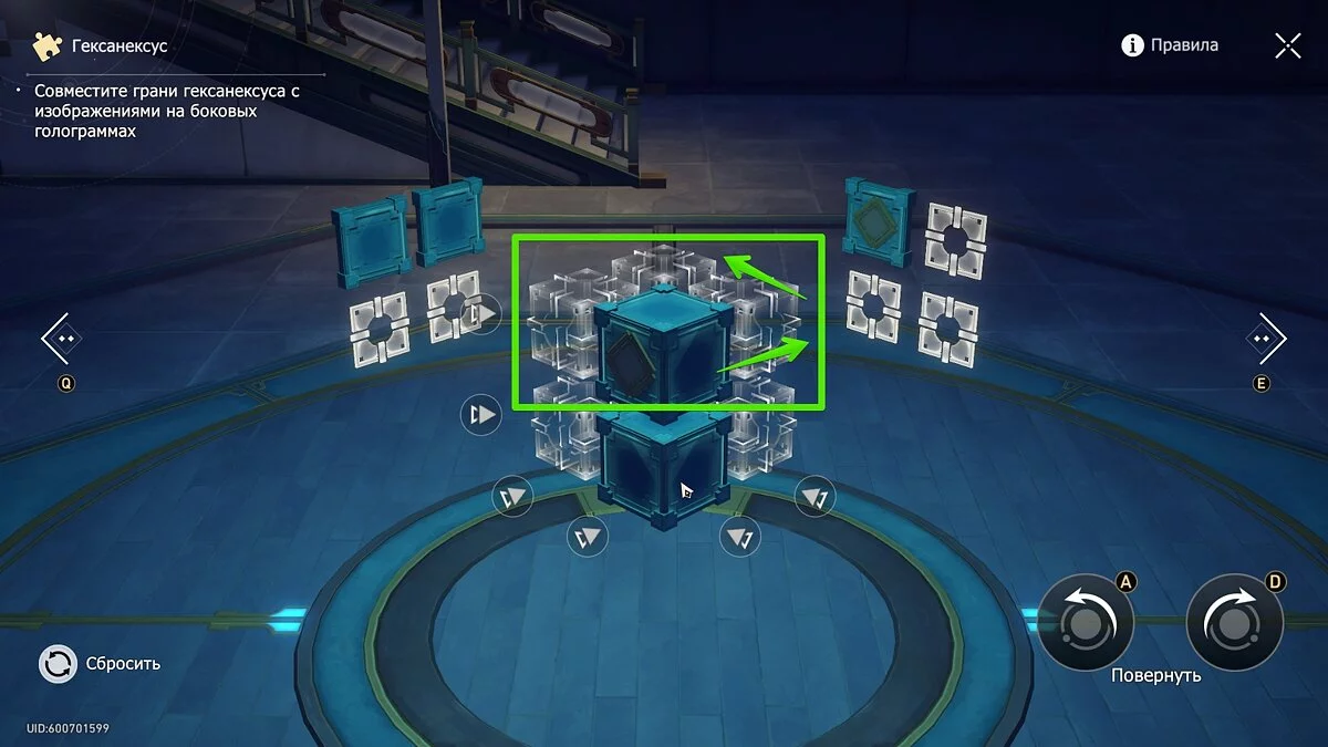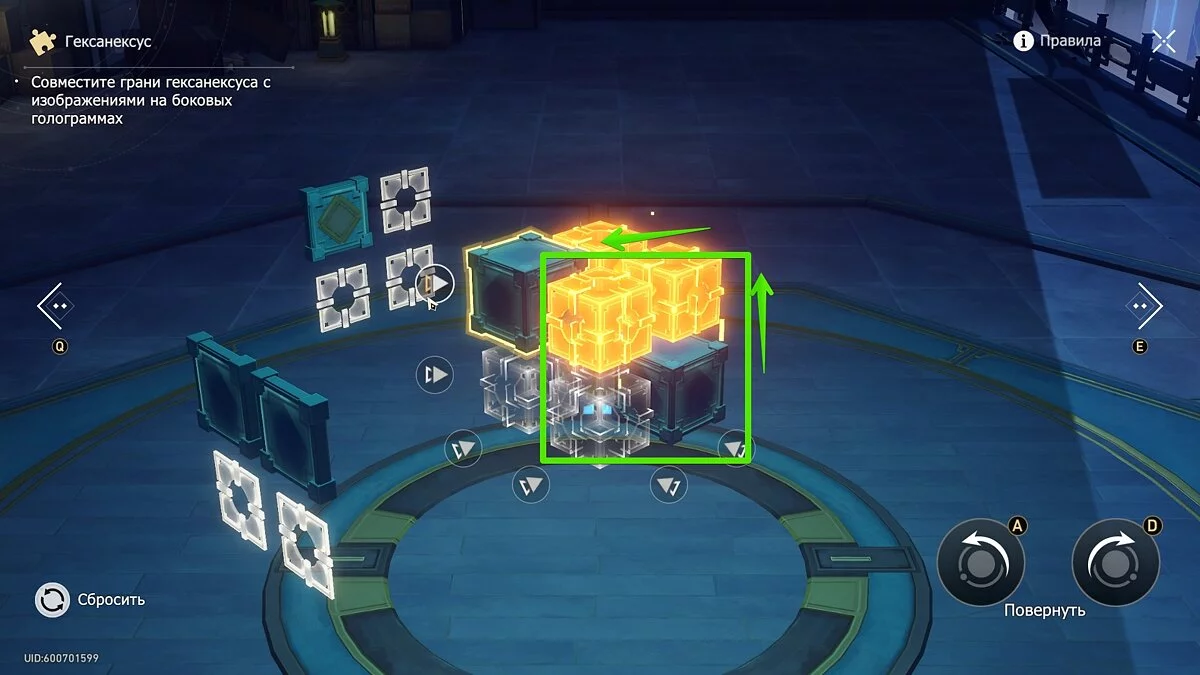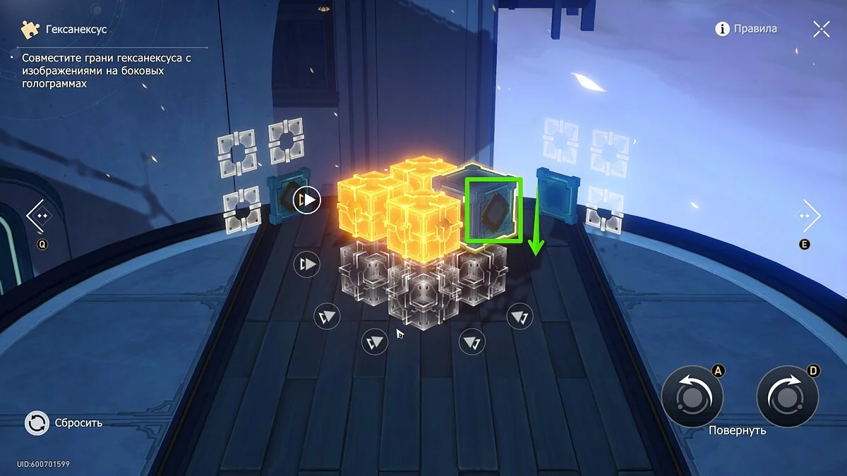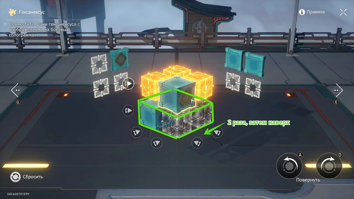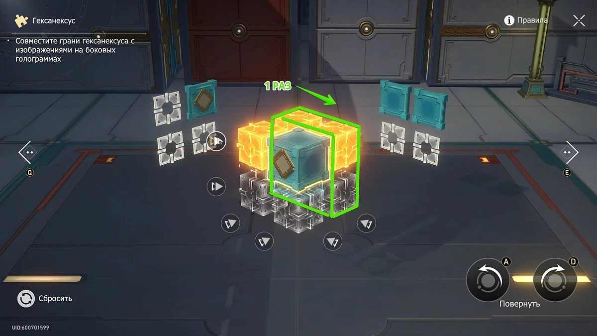 От предыдущего места телепортируйтесь в правую часть карты и взаимодействуйте с кубом. Дальний левый блок поверните вверх дважды, чтобы блок с узором встал на своё место.