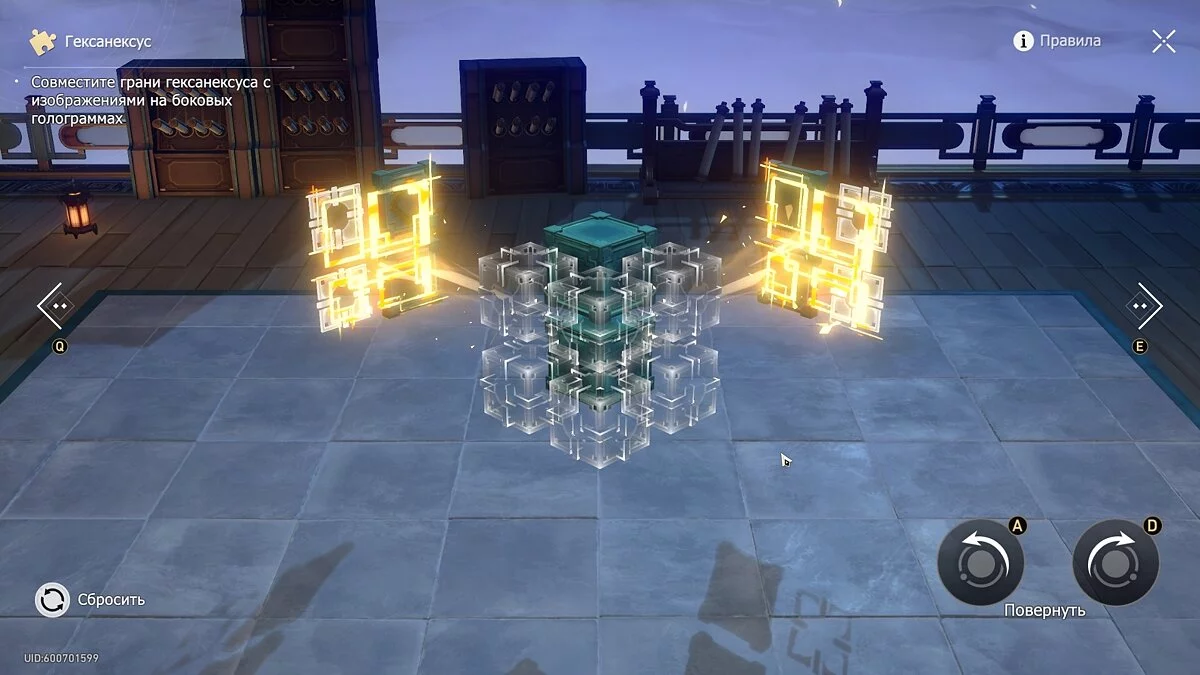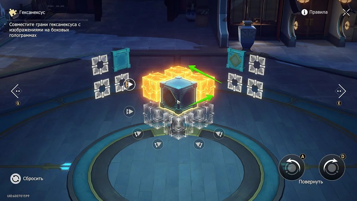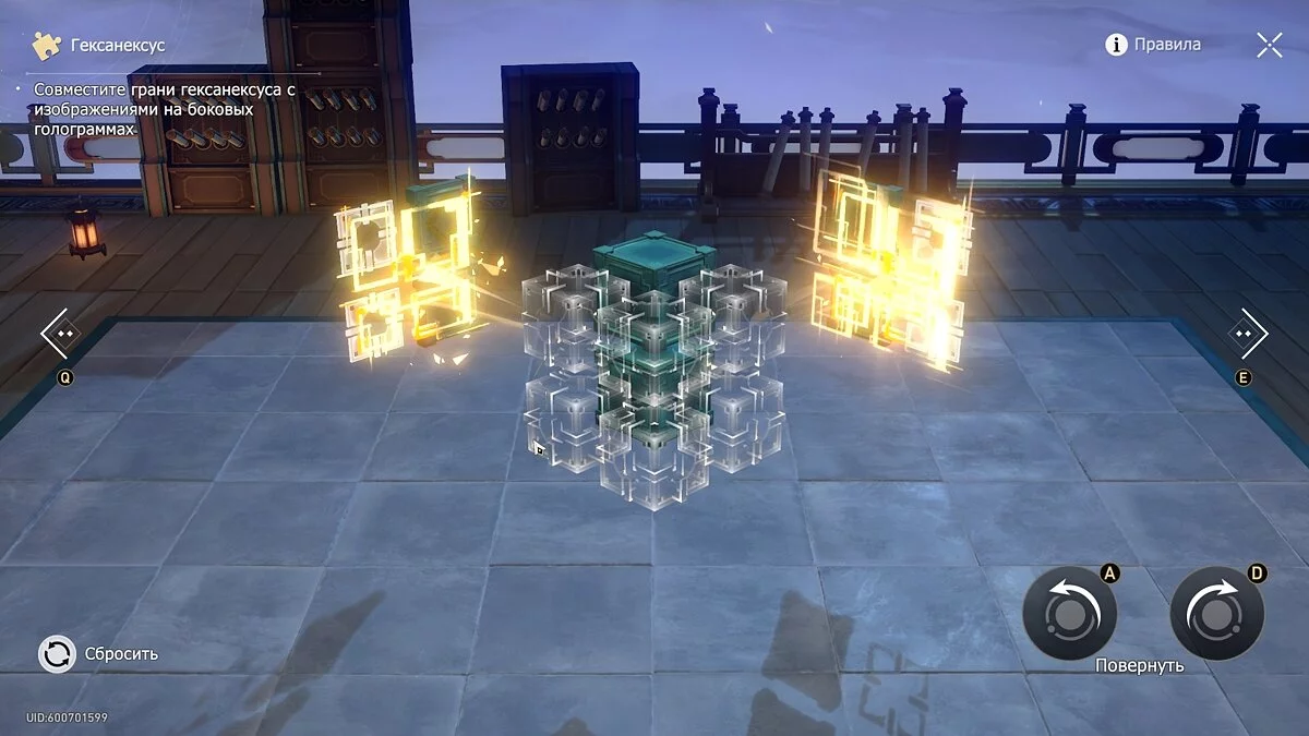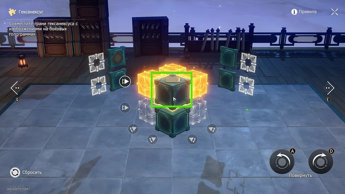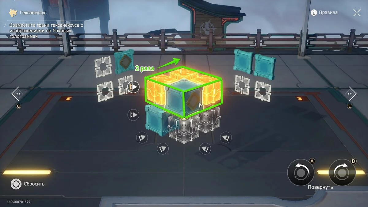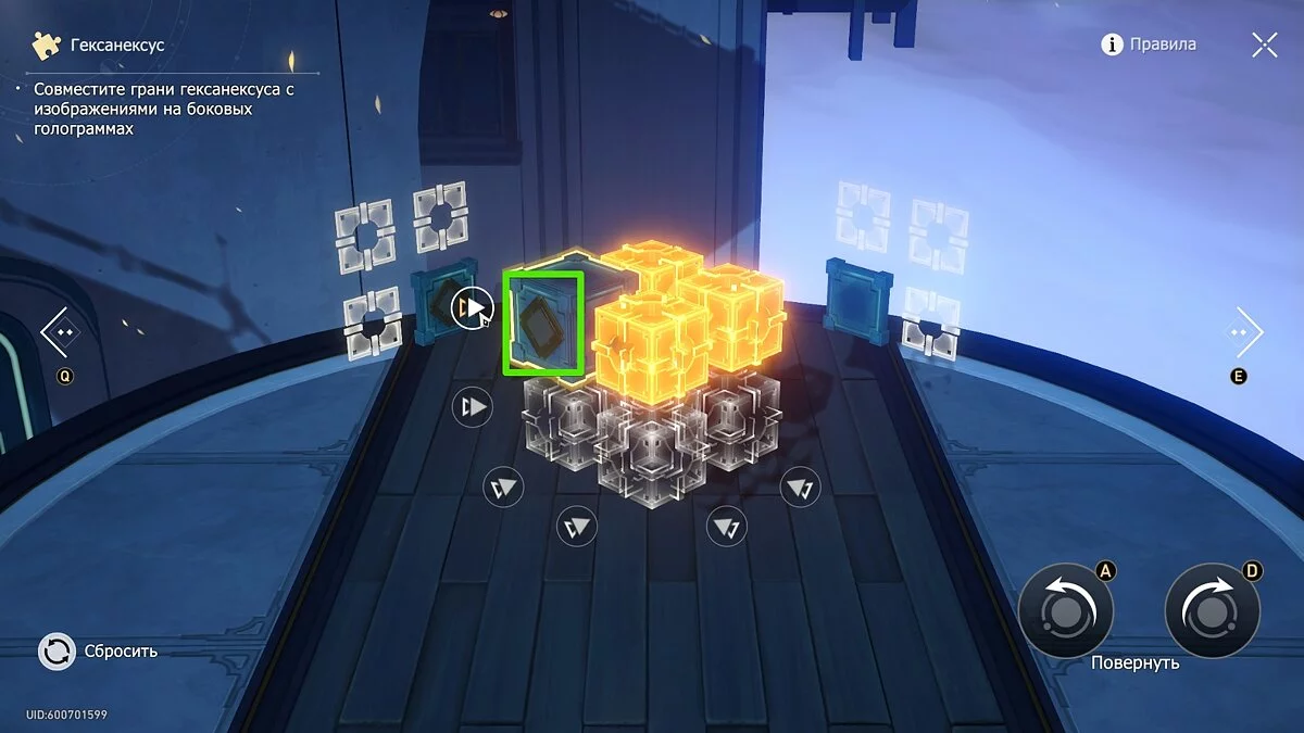 От предыдущего места телепортируйтесь в правую часть карты и взаимодействуйте с кубом. Дальний левый блок поверните вверх дважды, чтобы блок с узором встал на своё место.