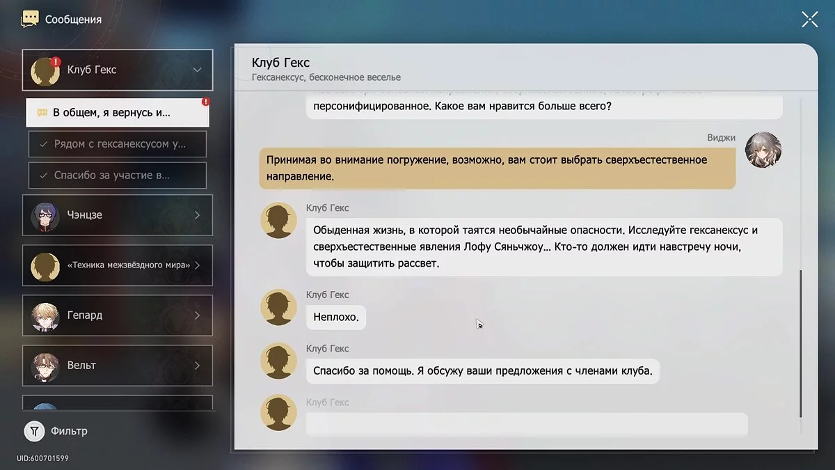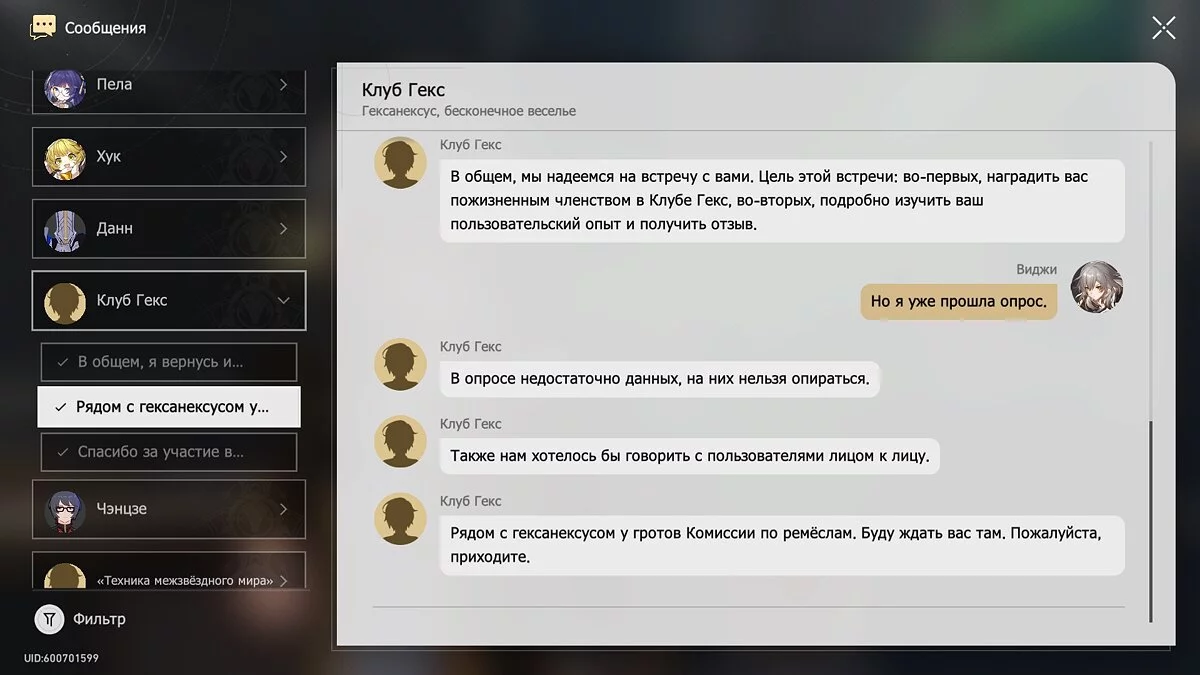 Сделав это, вы получите сообщение от Клуба Гекс, в котором будет небольшой опрос, а также приглашение на личную встречу. Отправляйтесь на Лофу Сяньчжоу в локацию «Комиссия по ремёслам». В левой верхней части локации вы встретите Умника — члена Клуба Гекс.