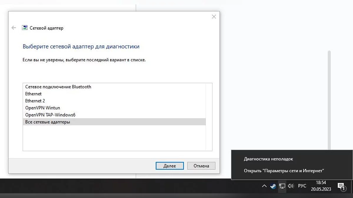 В области уведомлений (системный трей находится в правом нижнем углу экрана) найдите и кликните на значок сети ПКМ. Выберите пункт «Диагностика неполадок» и следуйте инструкциям в новом окне. С большинством проблем система справится самостоятельно, в остальных случаях предоставим вам подробную инструкцию для устранения неполадок.