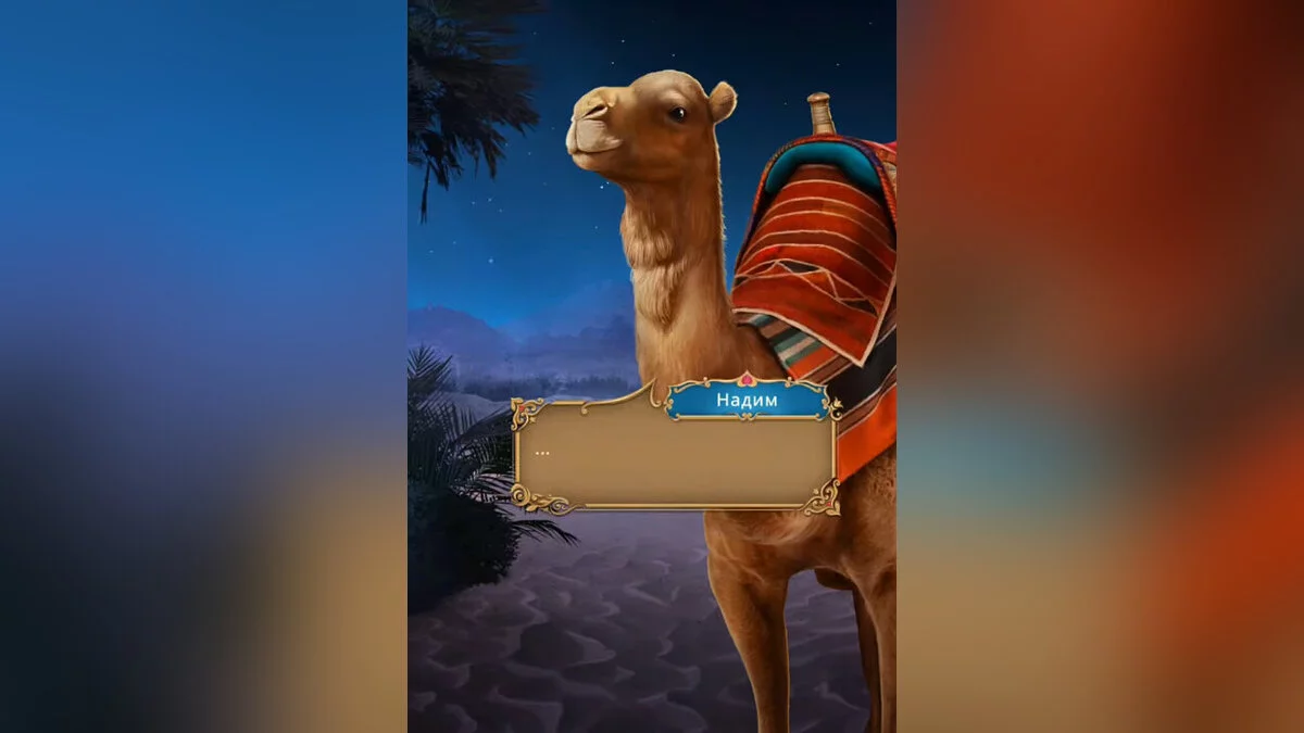 Девушка отчаялась и без сил упала на песок. Она ползла в неизвестном направлении и услышала шорох. Это был верблюд Надим. Ясмин забралась на него верхом и они отправились в сторону города.