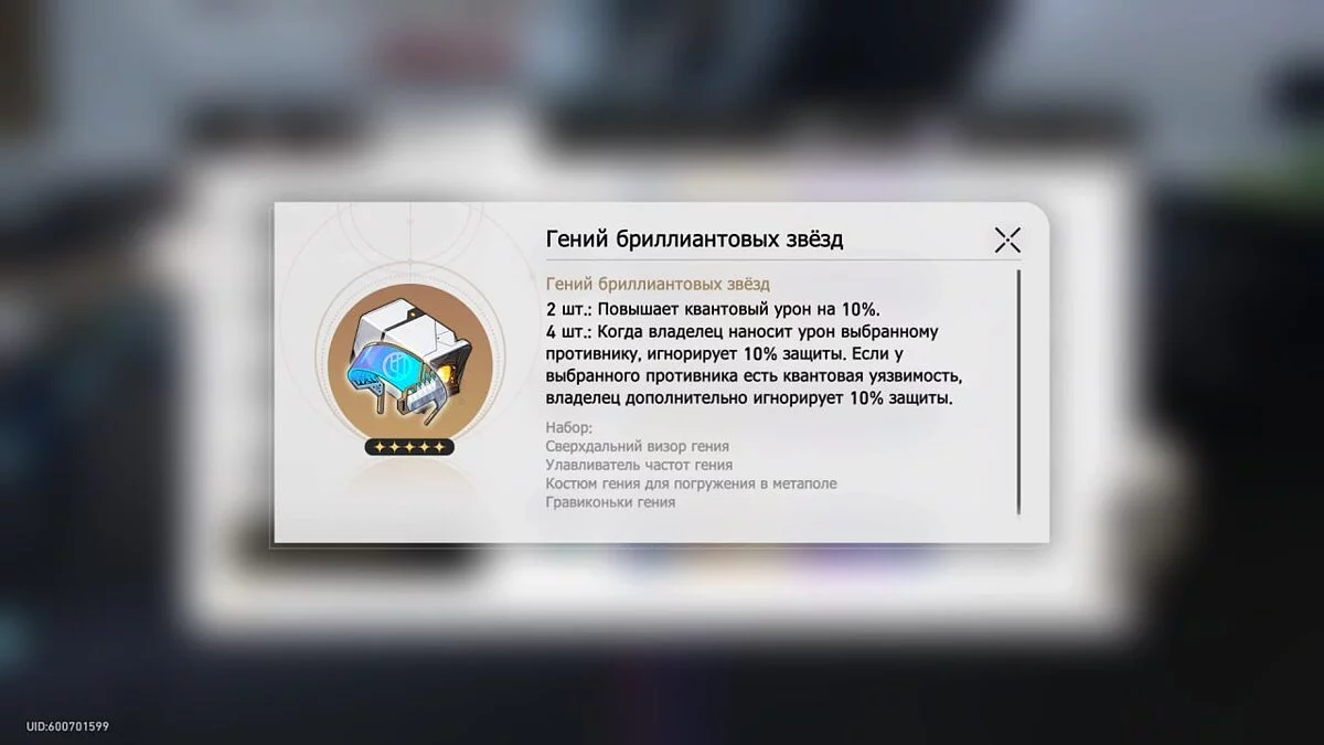 - Четыре предмета (Гений бриллиантовых звёзд + Стрелок дикой пшеницы): Квантовый урон повышается на 12%;