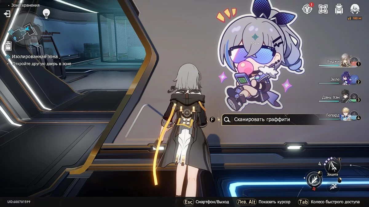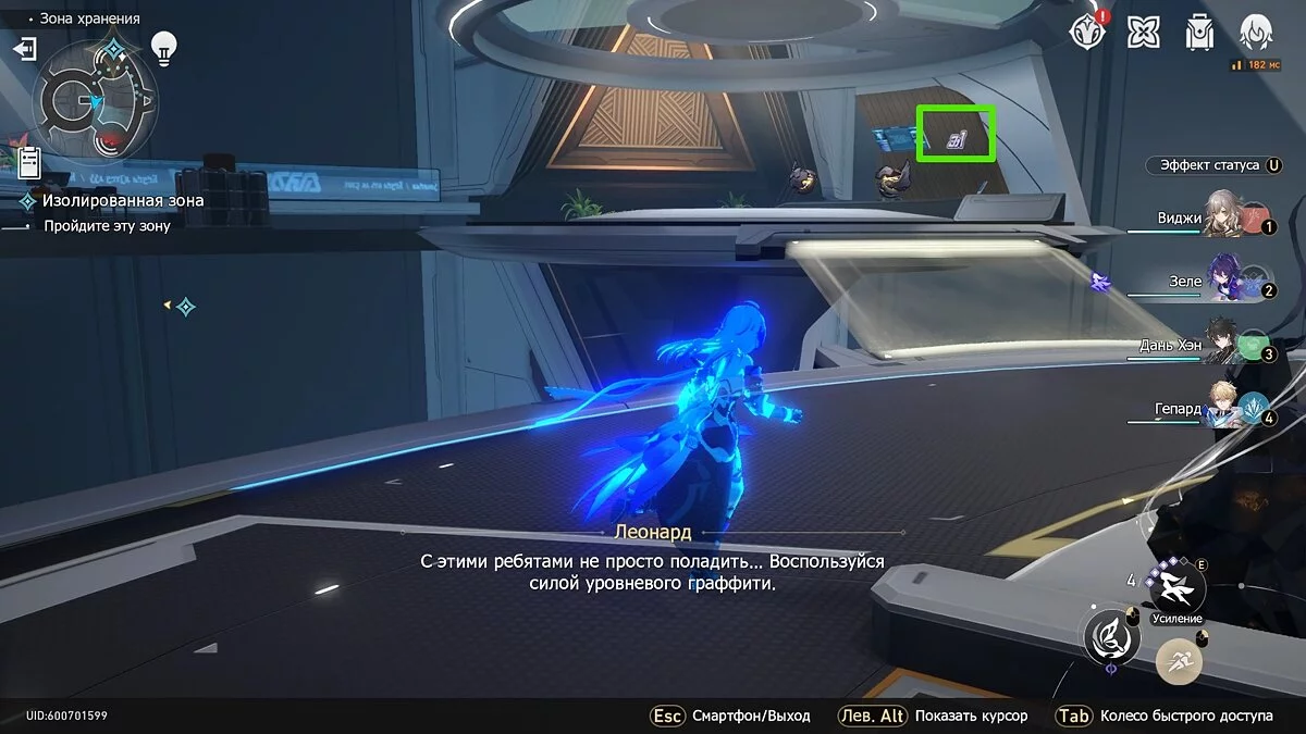 Эфирное граффити — специальные рисунки, разбросанные по области испытания. За нахождение изображений Визитной карточки взлома вы будете повышать уровень интенсивности виртуального подсчёта. Это особый навык, который станет наносить квантовый урон всем противникам на поле боя в начале каждого нового хода, а также истощать стойкость врагов независимо от типа уязвимости.