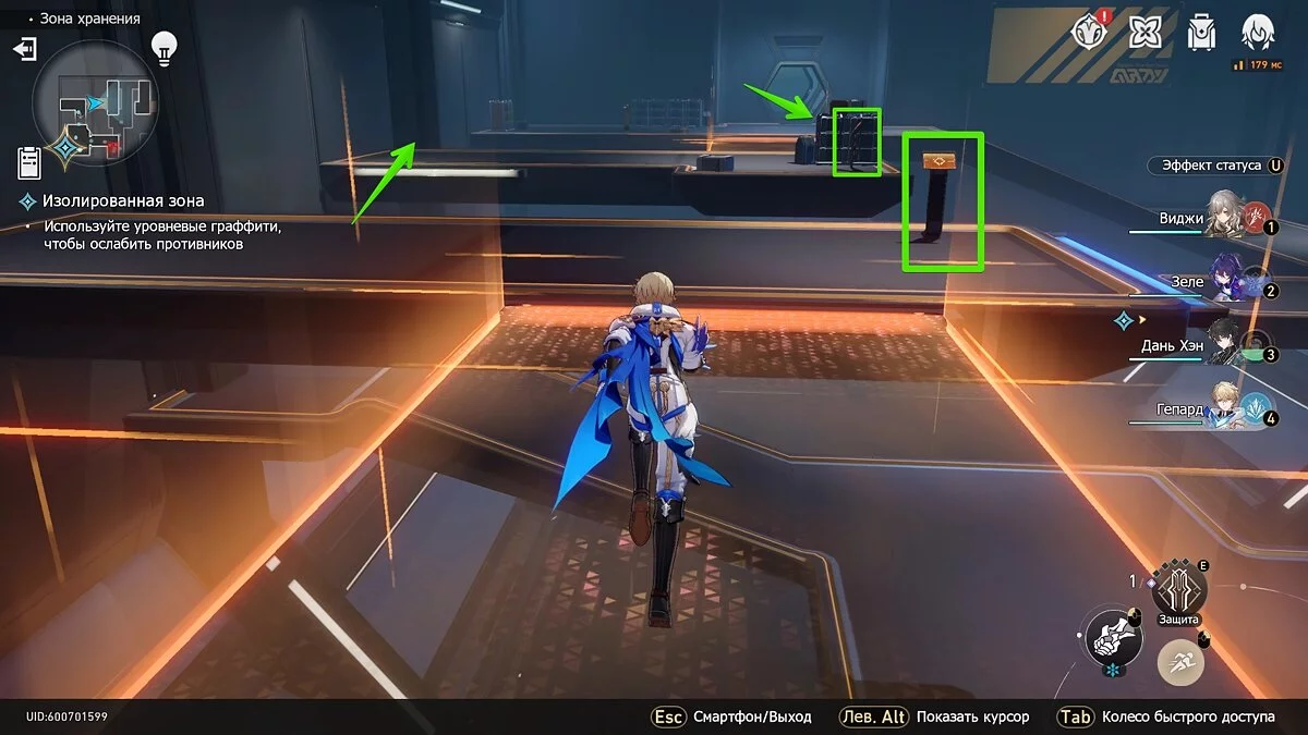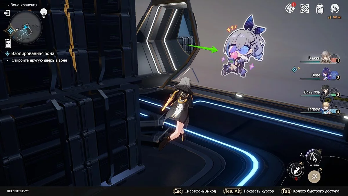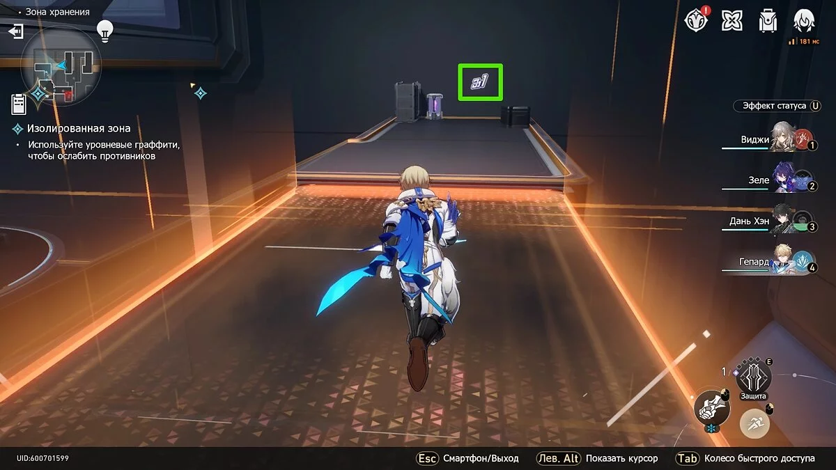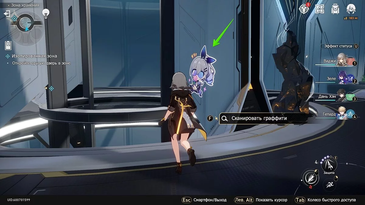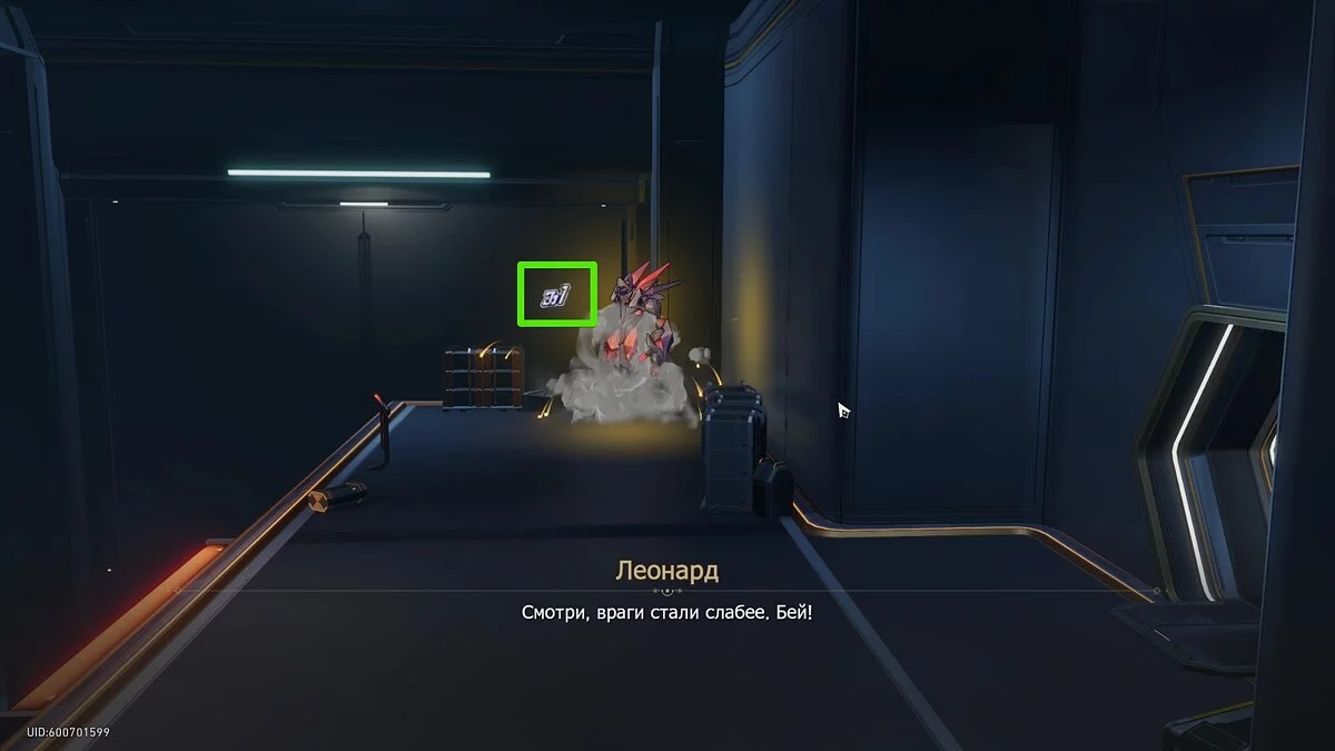 В следующем коридоре поверните направо, избавьтесь от группы монстров и войдите в отсек справа. Здесь на стене Визитная карточка взлома (3), а также граффити со знаком вопроса. Используйте его, чтобы телепортироваться и ослабить сильного противника.