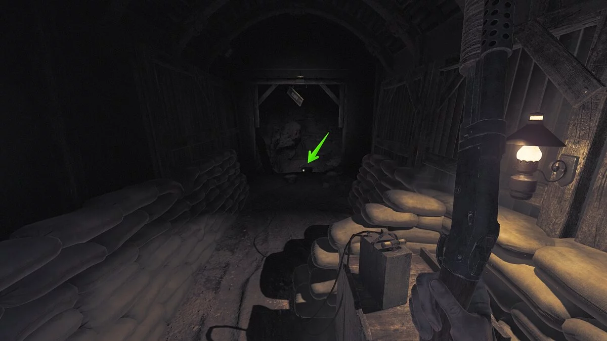 Вернитесь обратно на развилку и стреляйте в навесной замок на двери. Так вы попадёте в единственную безопасную зону с генератором. На столе есть несколько записок, а также жетон солдата. На стене висит карта — осмотрите её, чтобы узнать цели.