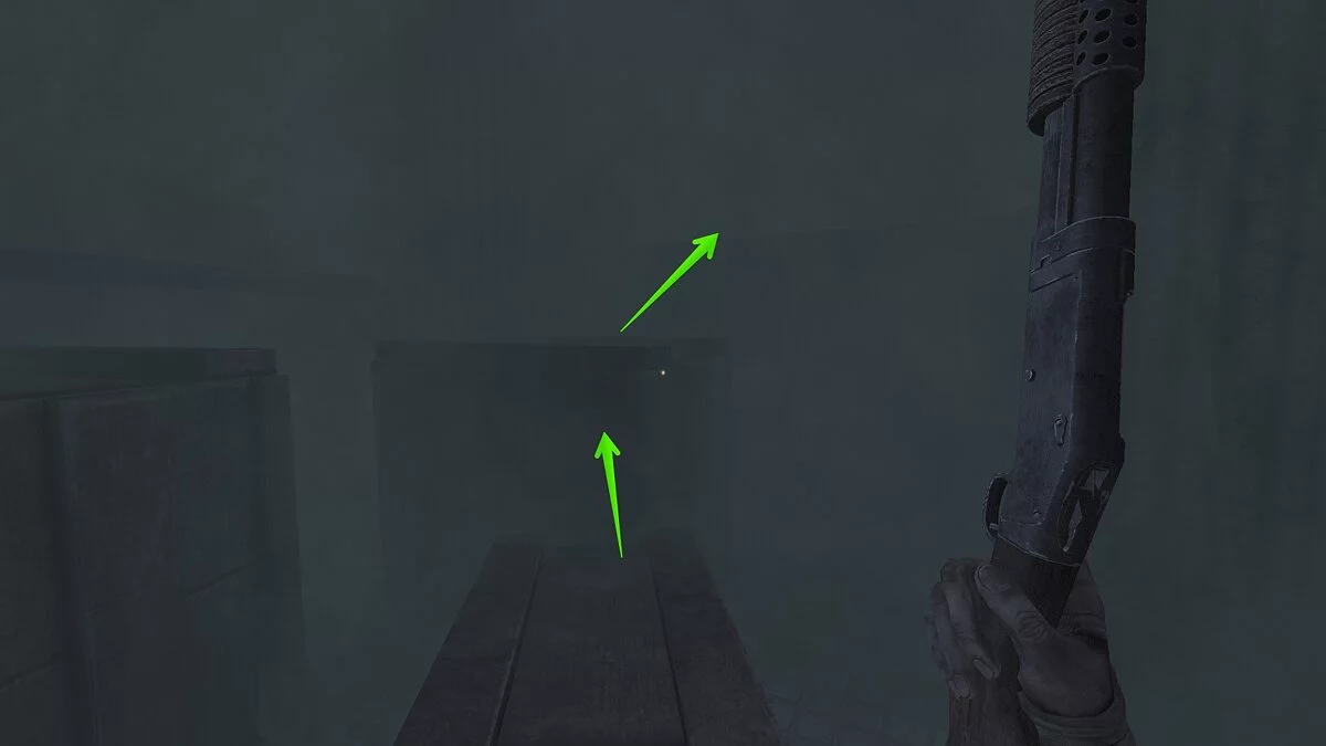 Сразу за ней вы увидите рукоятку. Предварительно вооружитесь, потому как после подбора на вас нападёт неизвестный. Он сделает один выстрел, после чего скроется. Старайтесь не шуметь и ориентируйтесь по звуку. Убейте парня, чтобы заполучить дробовик.