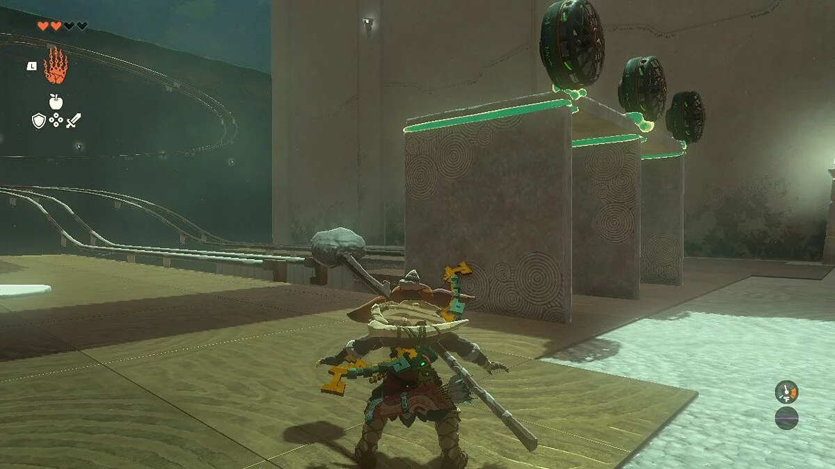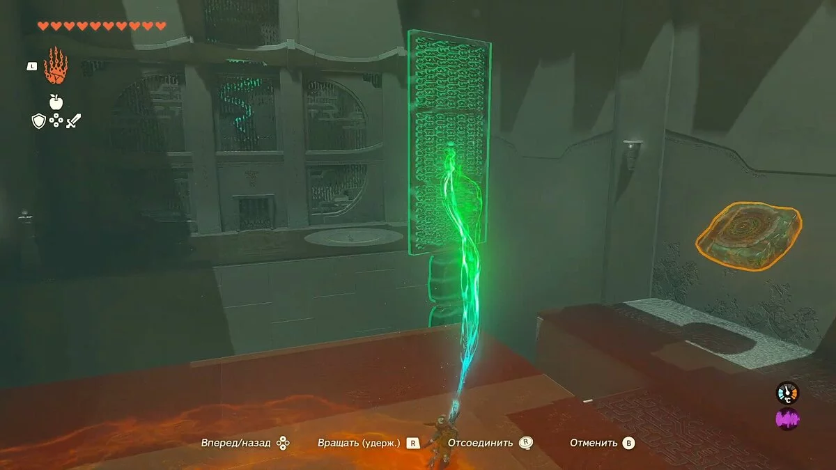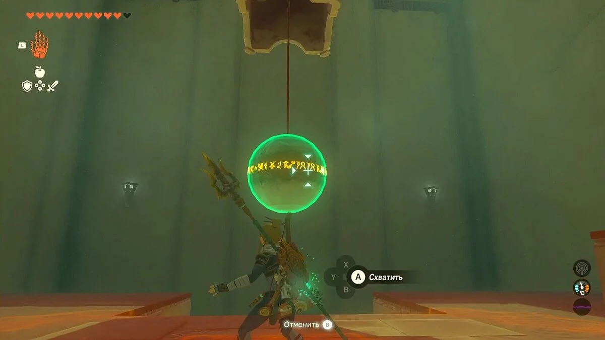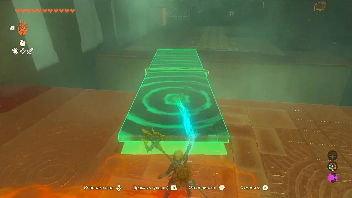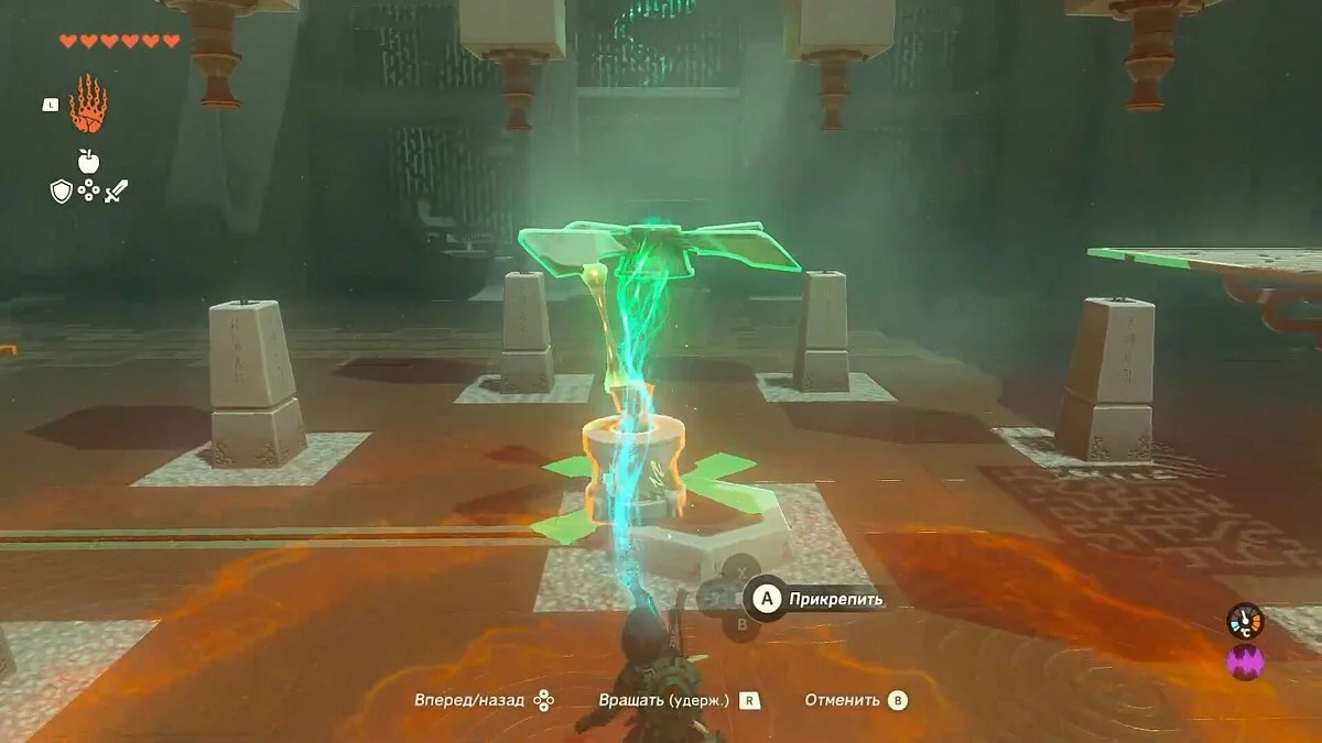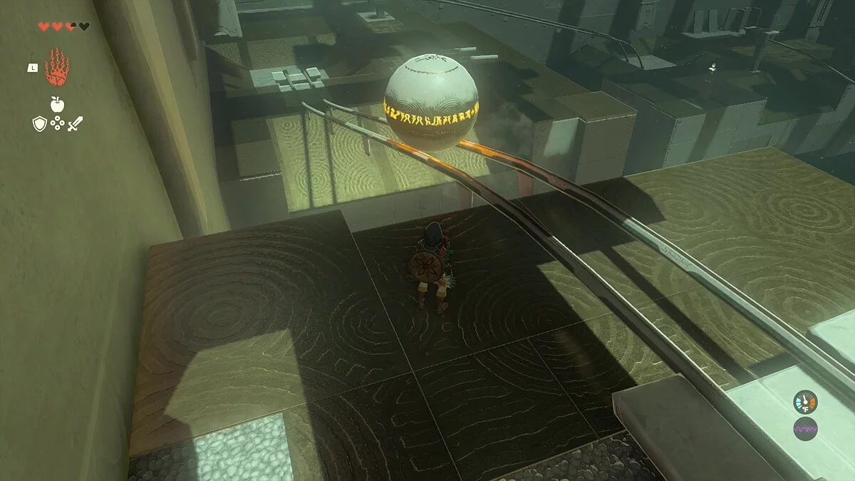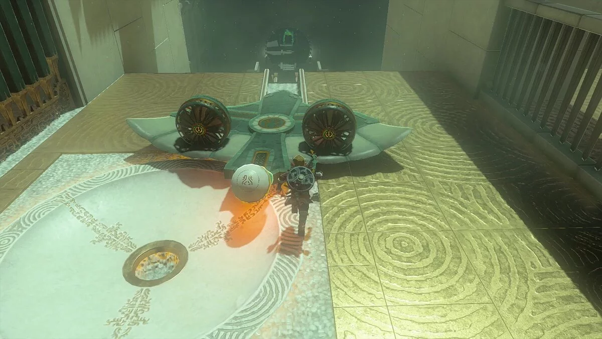 Поднимитесь на платформе на следующий этаж и поместите шар в отверстие. Используйте планер на недавно опущенные ворота. Поскольку вам больше не нужно, чтобы эти ворота были открыты, возьмите сферу еще раз с помощью Комбикинеза и прикрепите её к планеру. Поместите планер на рельсы, ведущие от платформы, запрыгните на планер и ударьте по вентиляторам, чтобы вернуть Линка и сферу обратно ко входу в храм.