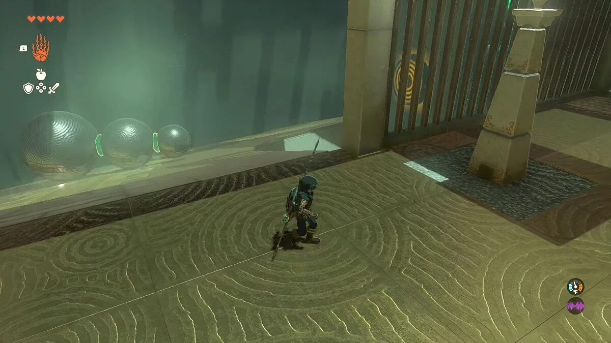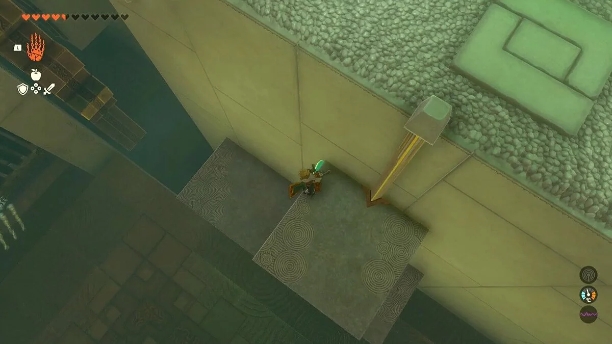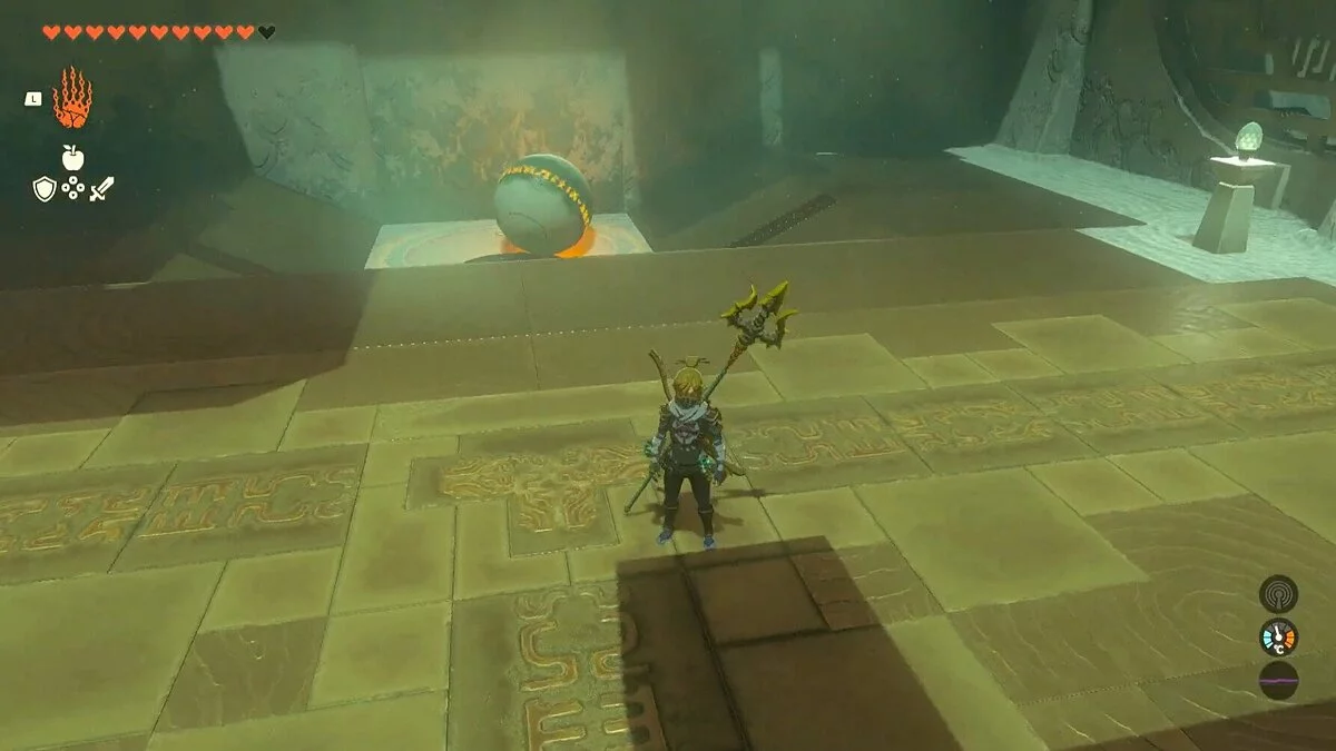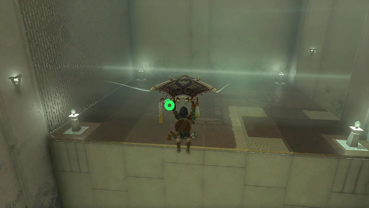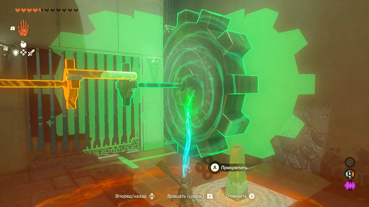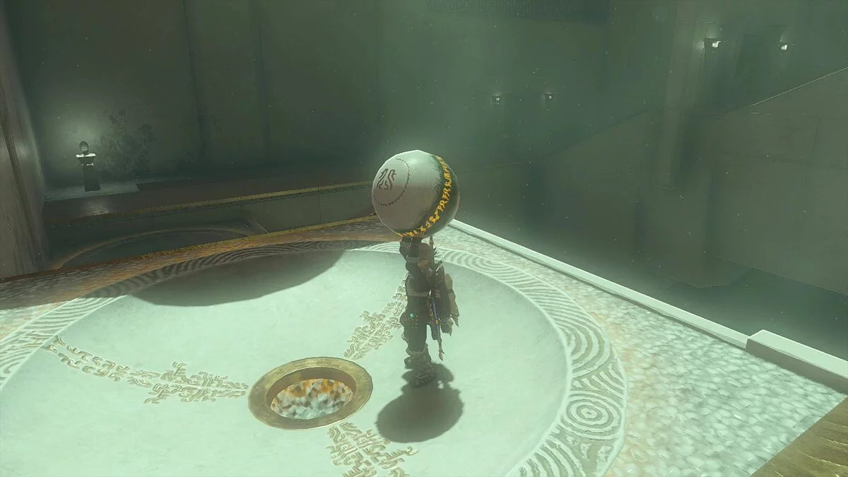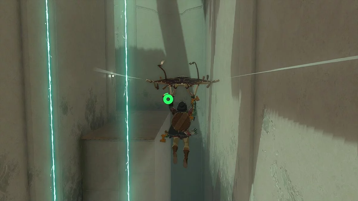 Поднимитесь на платформе на следующий этаж и поместите шар в отверстие. Используйте планер на недавно опущенные ворота. Поскольку вам больше не нужно, чтобы эти ворота были открыты, возьмите сферу еще раз с помощью Комбикинеза и прикрепите её к планеру. Поместите планер на рельсы, ведущие от платформы, запрыгните на планер и ударьте по вентиляторам, чтобы вернуть Линка и сферу обратно ко входу в храм.