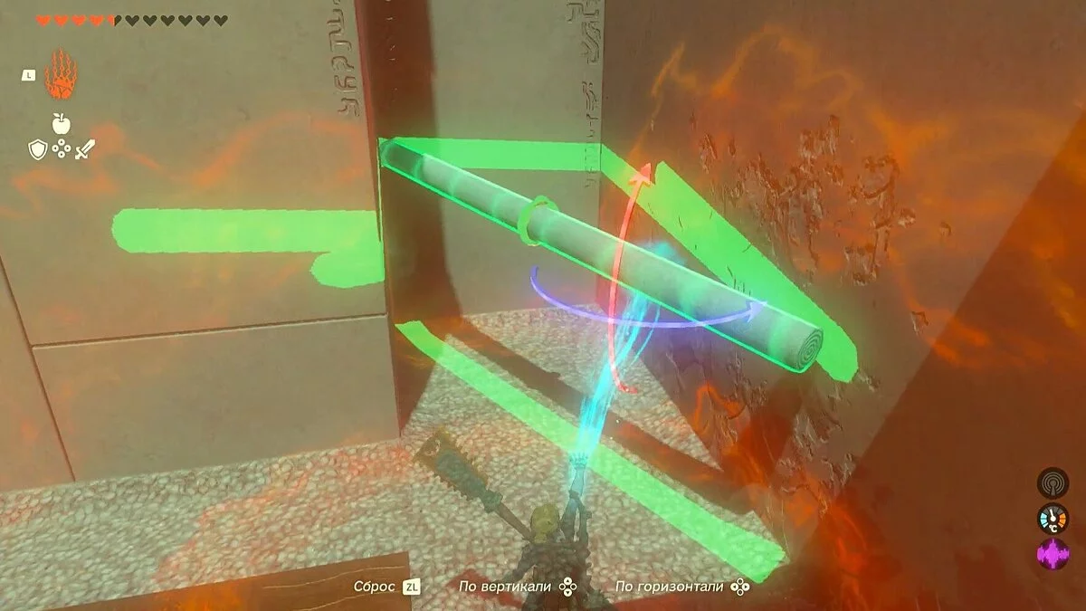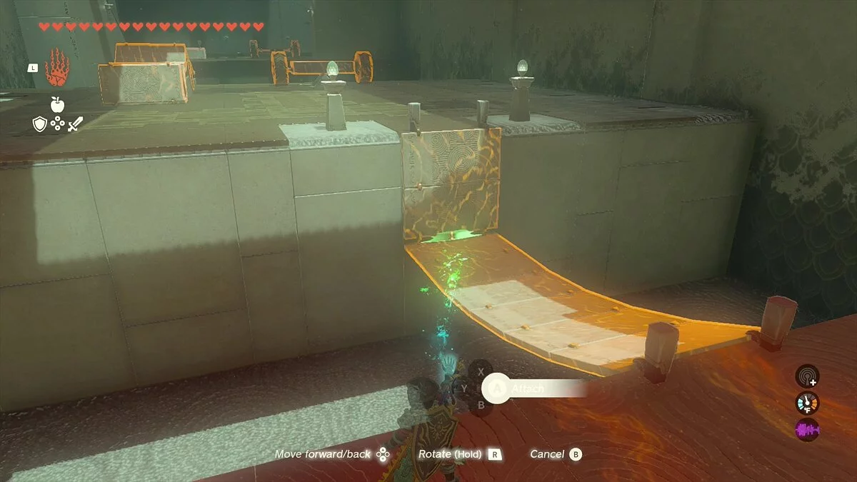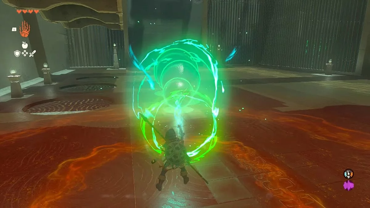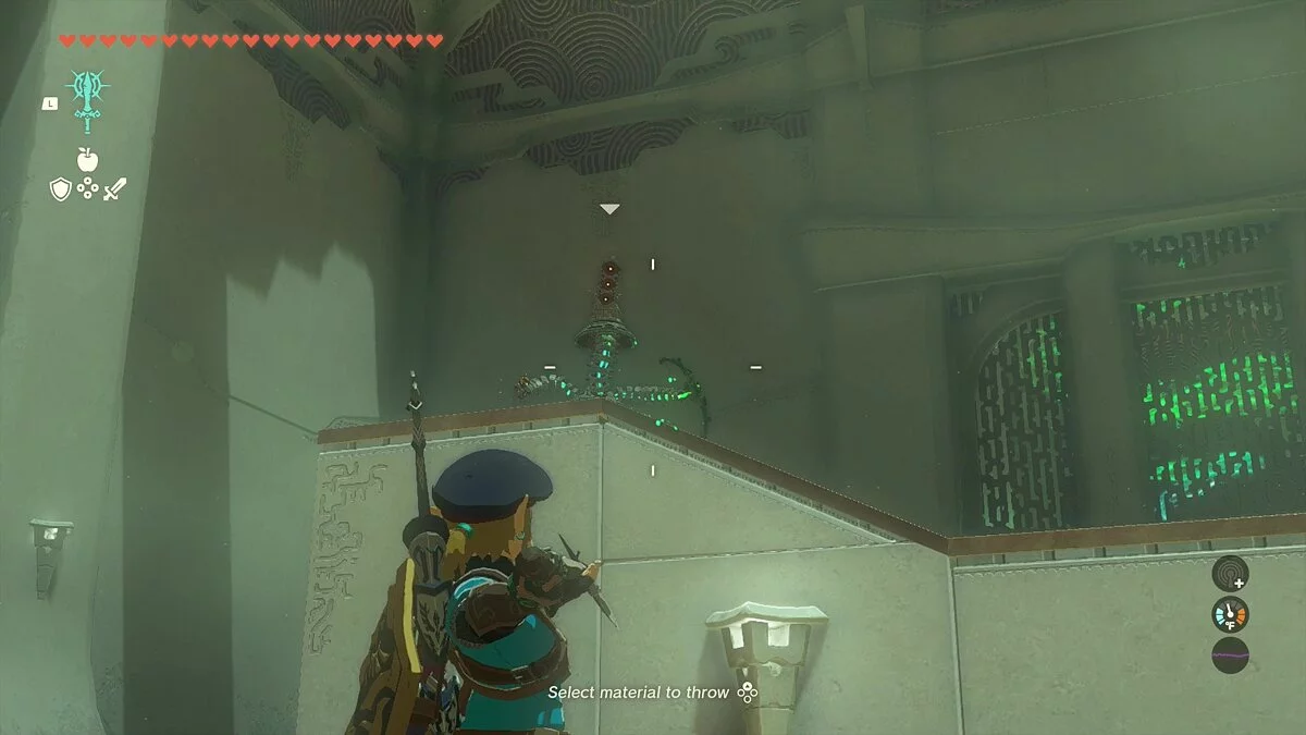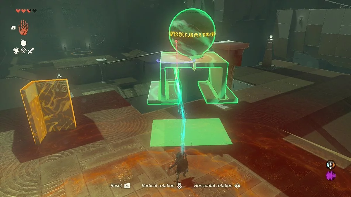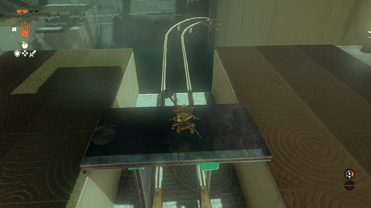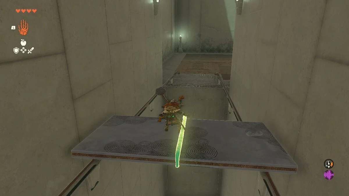Поднимитесь на платформе на следующий этаж и поместите шар в отверстие. Используйте планер на недавно опущенные ворота. Поскольку вам больше не нужно, чтобы эти ворота были открыты, возьмите сферу еще раз с помощью Комбикинеза и прикрепите её к планеру. Поместите планер на рельсы, ведущие от платформы, запрыгните на планер и ударьте по вентиляторам, чтобы вернуть Линка и сферу обратно ко входу в храм.